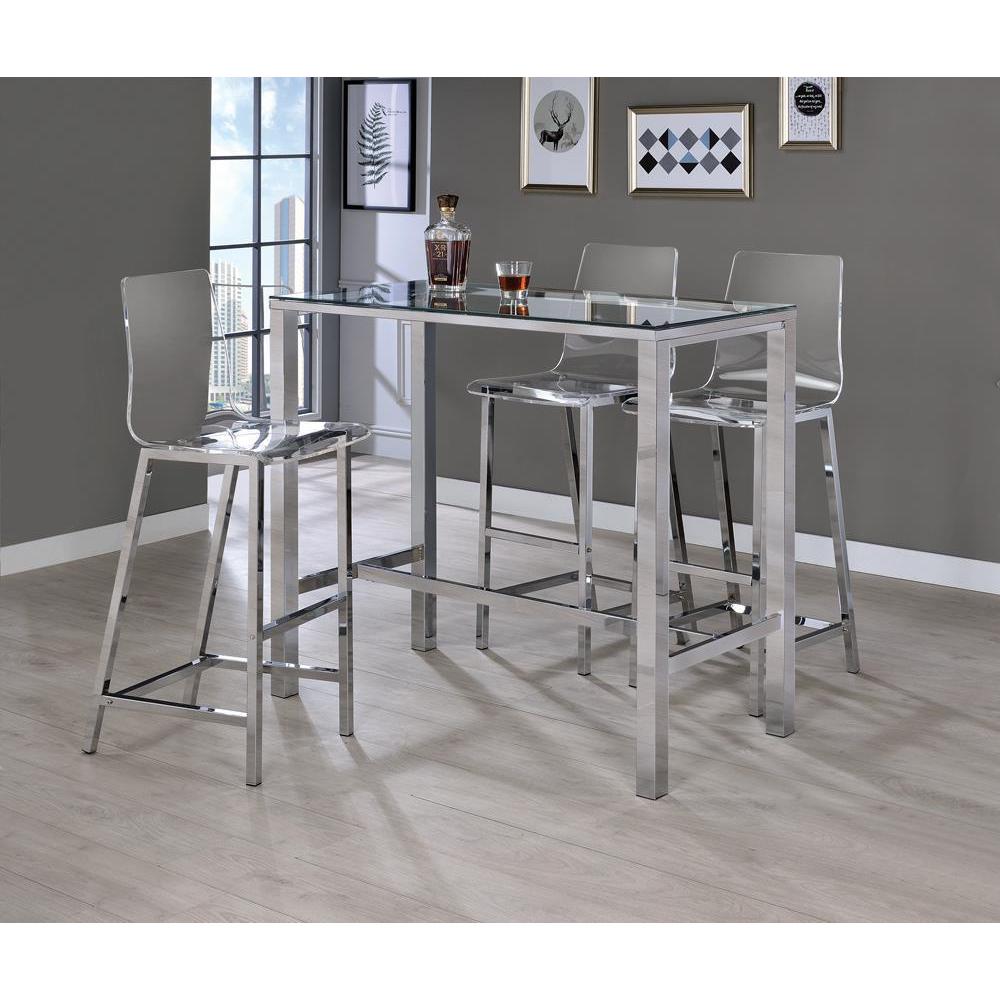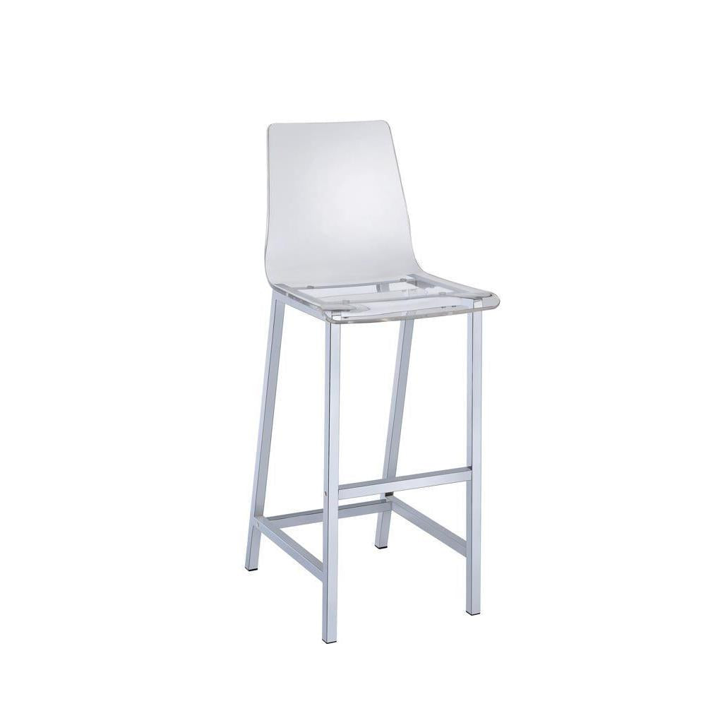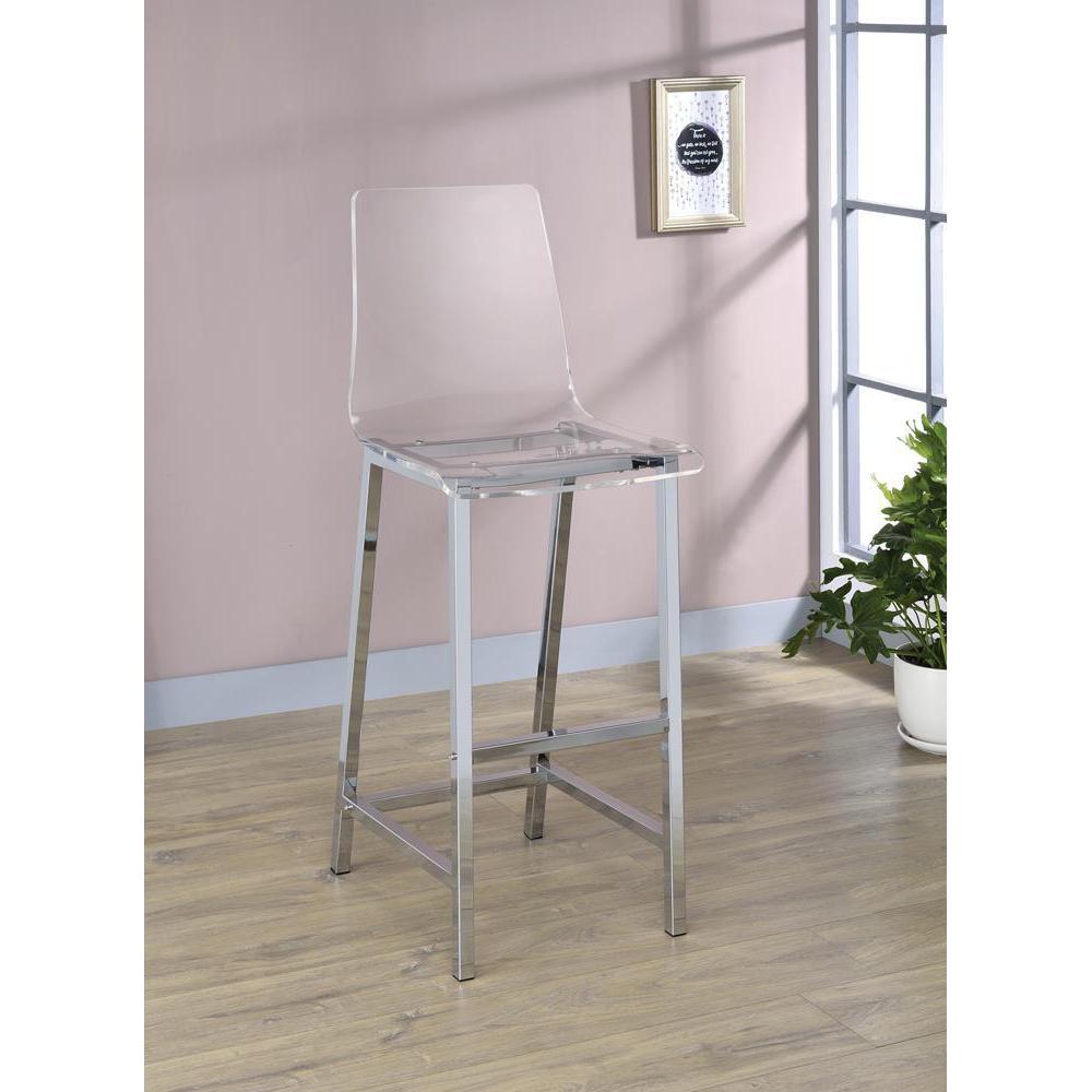 Update your decor with the intriguing design of this modern bar stool. its contemporary aesthetic is truly pleasing to the eye. constructed from metal, it has a sleek silhouette that's livened up with clear acrylic accents. its long, sleek legs boast a gleaming finish of chrome, balancing out its striking appearance with a pleasing hint of polish. a wide back and convenient foot pedestal provide comfy support for your back and feet.