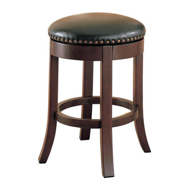 Classy and chic, this backless bar stool adds an air of understated luxury anywhere you choose to entertain. its four wooden legs have a slight curvature, elegantly flaring out from its sturdy seat. its comfy, padded seat conveniently swivels and is upholstered in soft, brown leatherette. decorative metal rivets give it a hint of classic glamour. with a 24-inch height, this stool can be easily tucked under a bar or counter to help you save space.