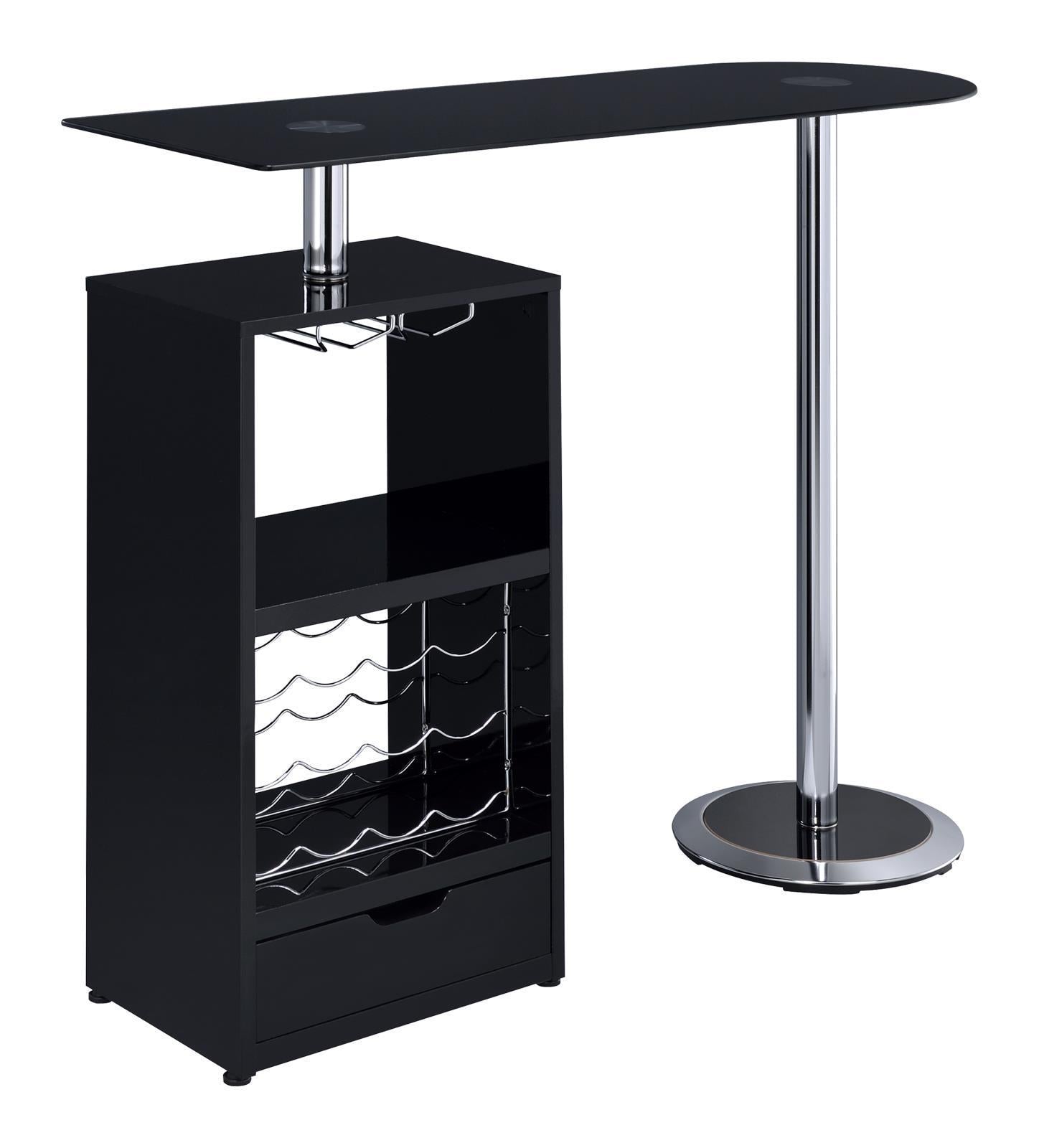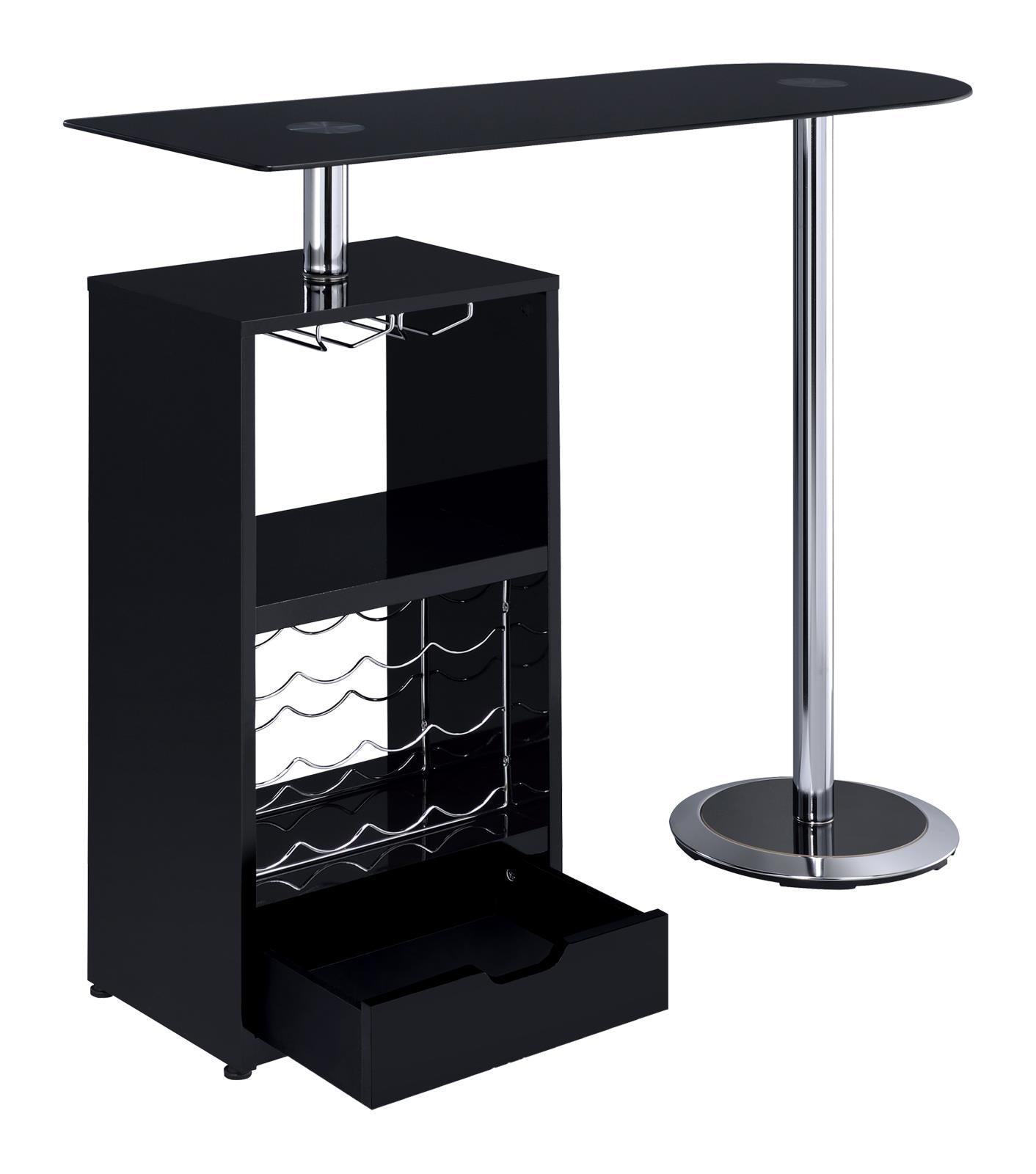 No home bar is complete without a bar table that's both functional and fashionable. table top is rectangular and fashioned with tempered glass. table also comes with contemporary bar unit featuring a spacious storage compartment. also features wine bottle storage and stemware rack for added convenience. this table goes well in a home bar, of course, but also adds character to a home entertainment room.