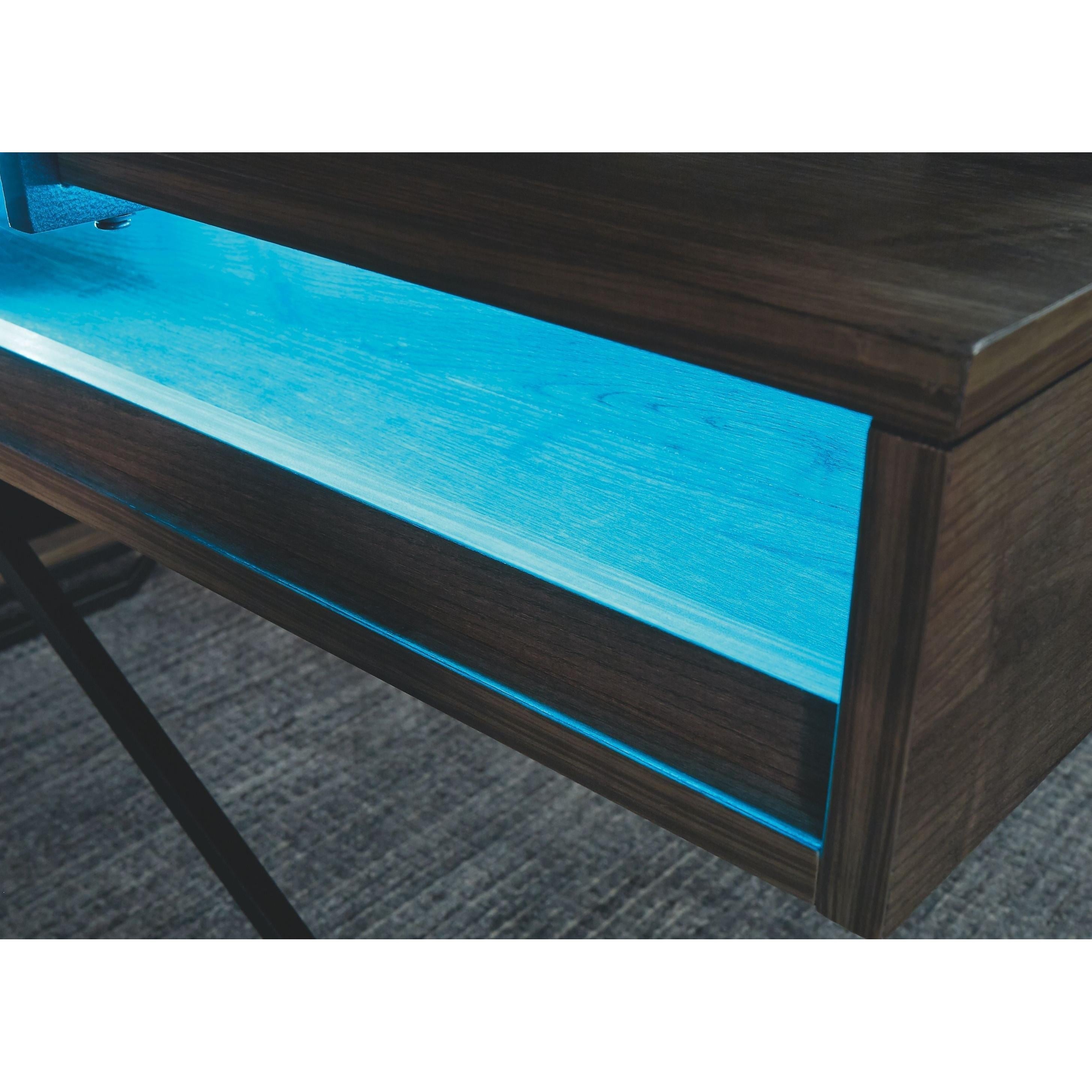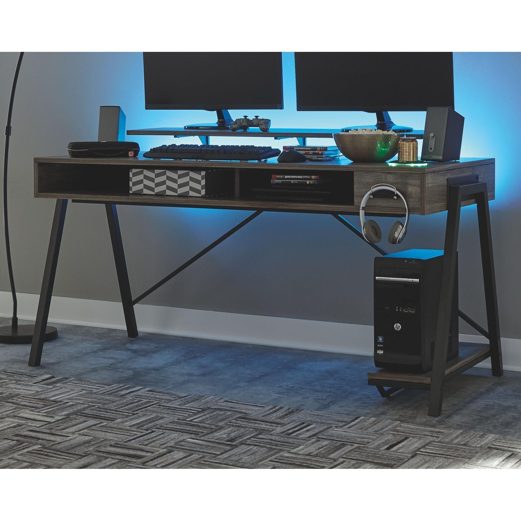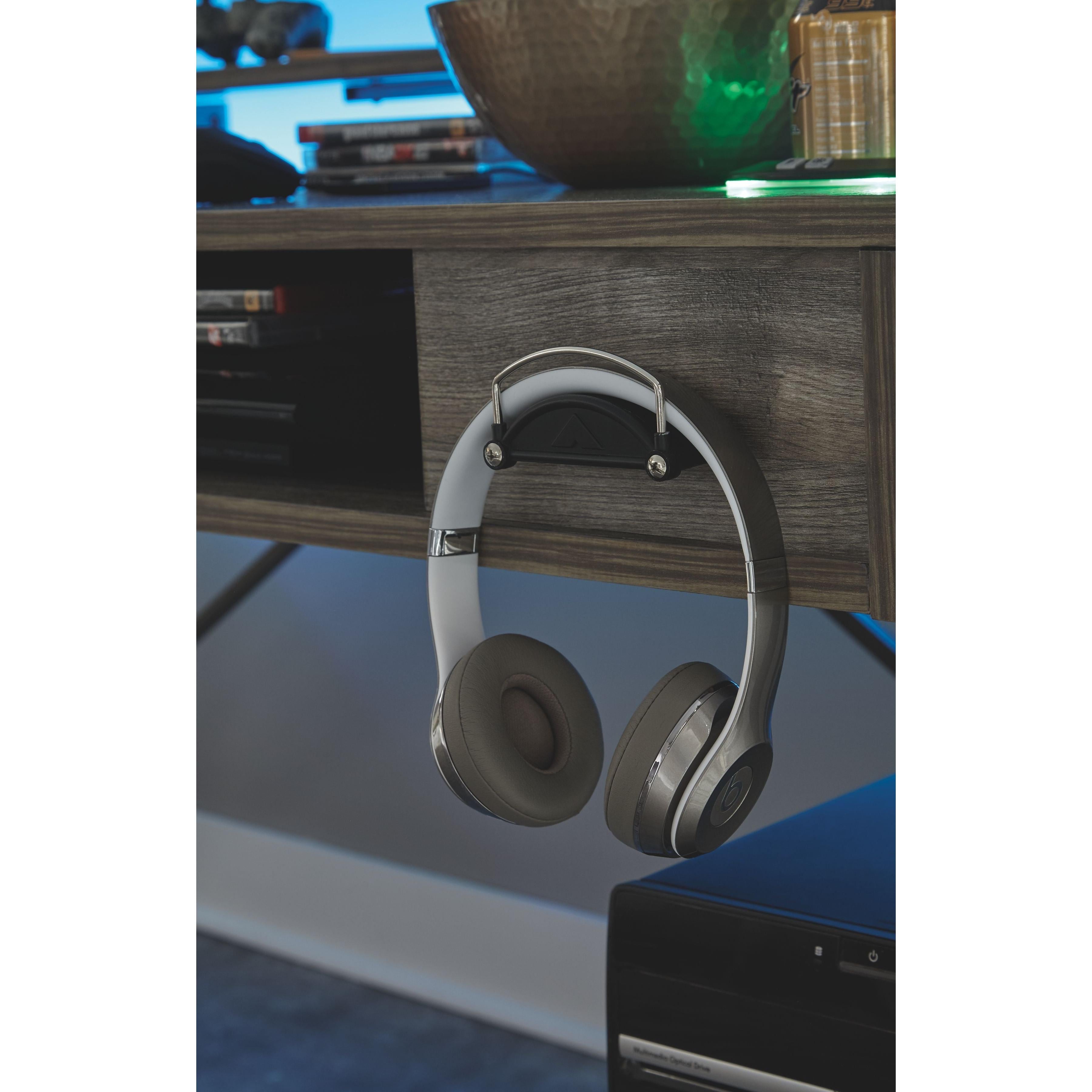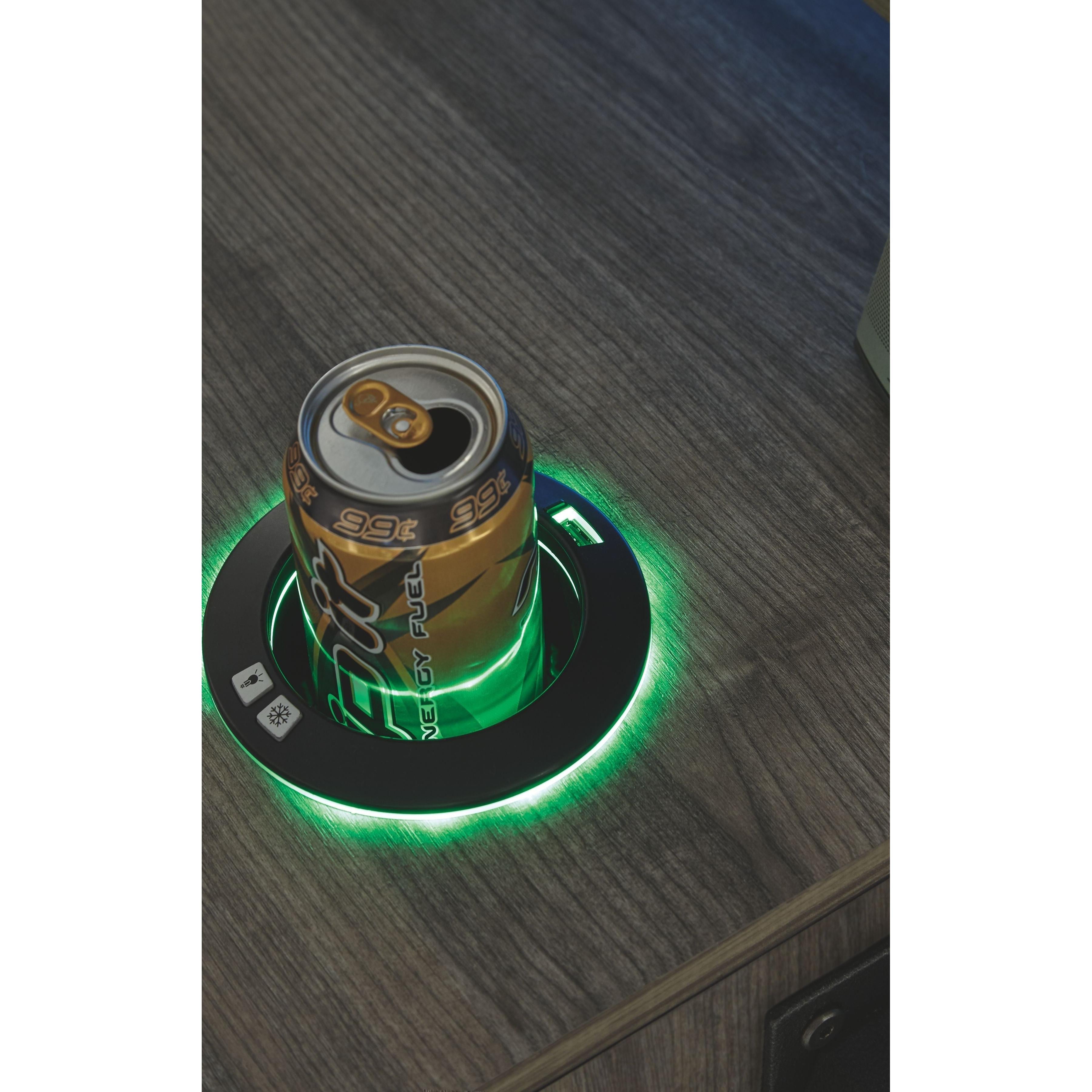 Elevate your style and up your game with this ultra-cool gaming desk. Clean and contemporary, this mixed media designer desk includes a metal frame in silvertone finish, topped with an engineered wood surface with replicated wood grain. Setting you up for success: a large open raceway for power cord management, desk top monitor shelf and an LED back light with multiple color options for an enhanced gaming experience. Along with a PC stand for easy access, this gaming desk features a custom designed headset hanger and a built-in electric can cooler with USB plug-in.