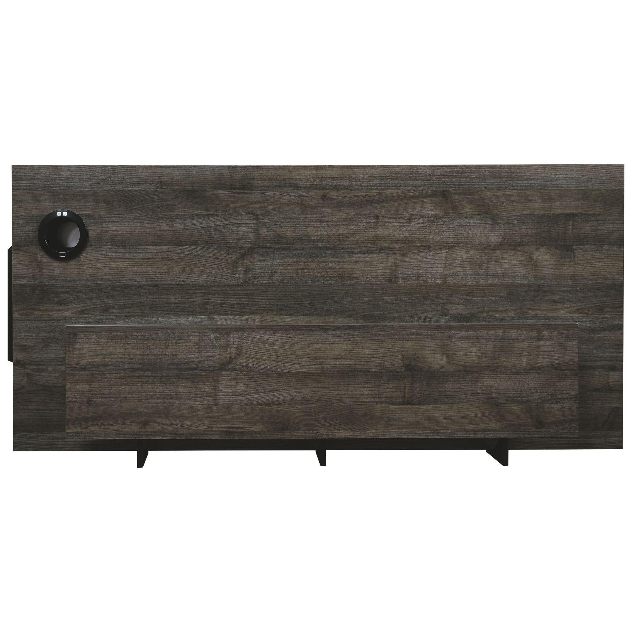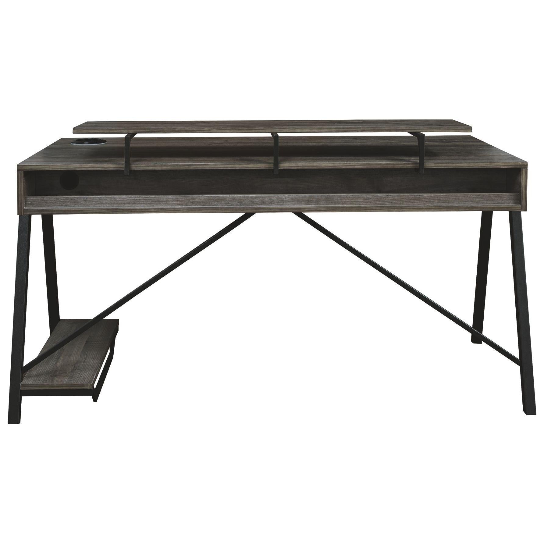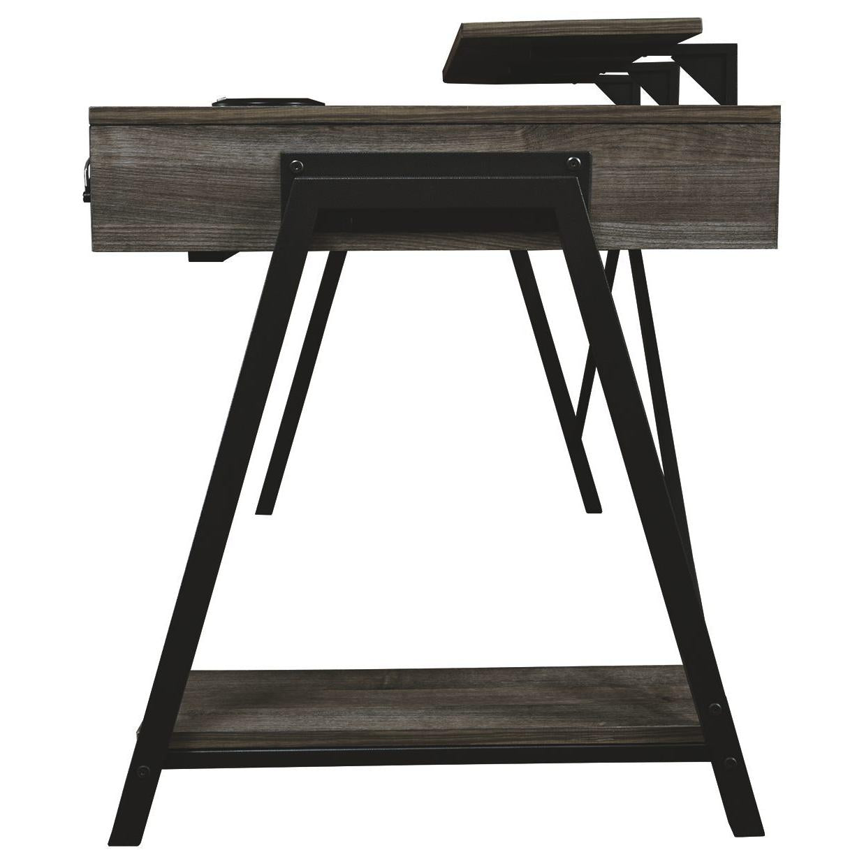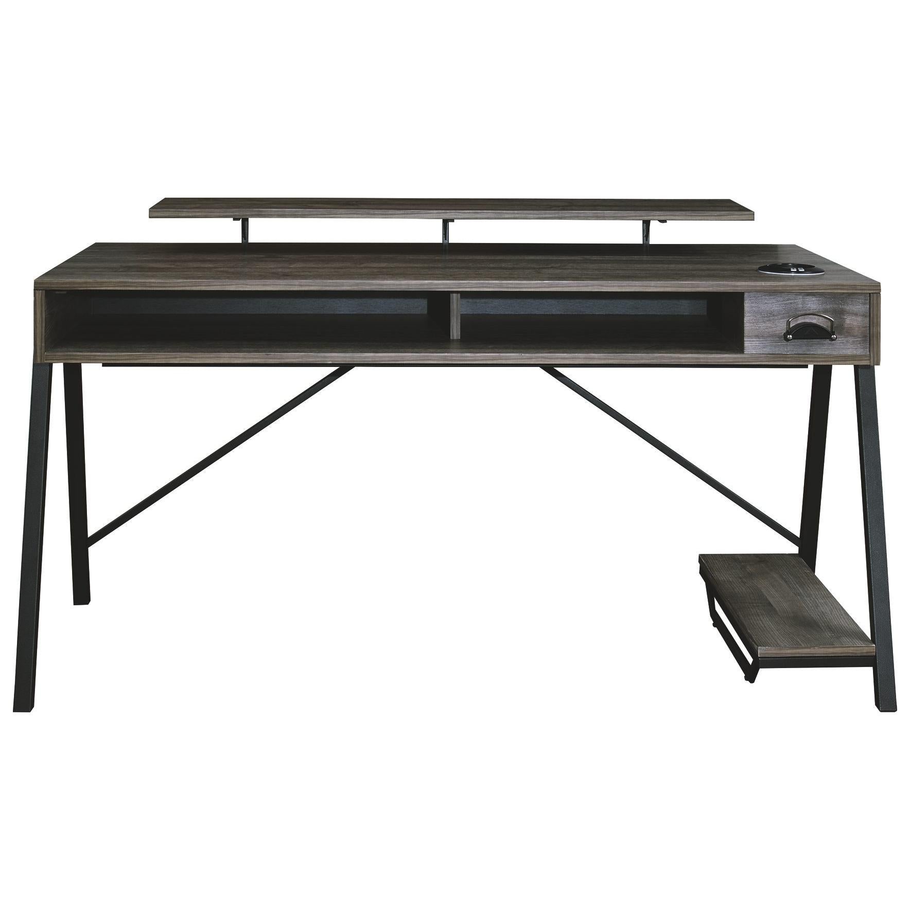 Elevate your style and up your game with this ultra-cool gaming desk. Clean and contemporary, this mixed media designer desk includes a metal frame in silvertone finish, topped with an engineered wood surface with replicated wood grain. Setting you up for success: a large open raceway for power cord management, desk top monitor shelf and an LED back light with multiple color options for an enhanced gaming experience. Along with a PC stand for easy access, this gaming desk features a custom designed headset hanger and a built-in electric can cooler with USB plug-in.