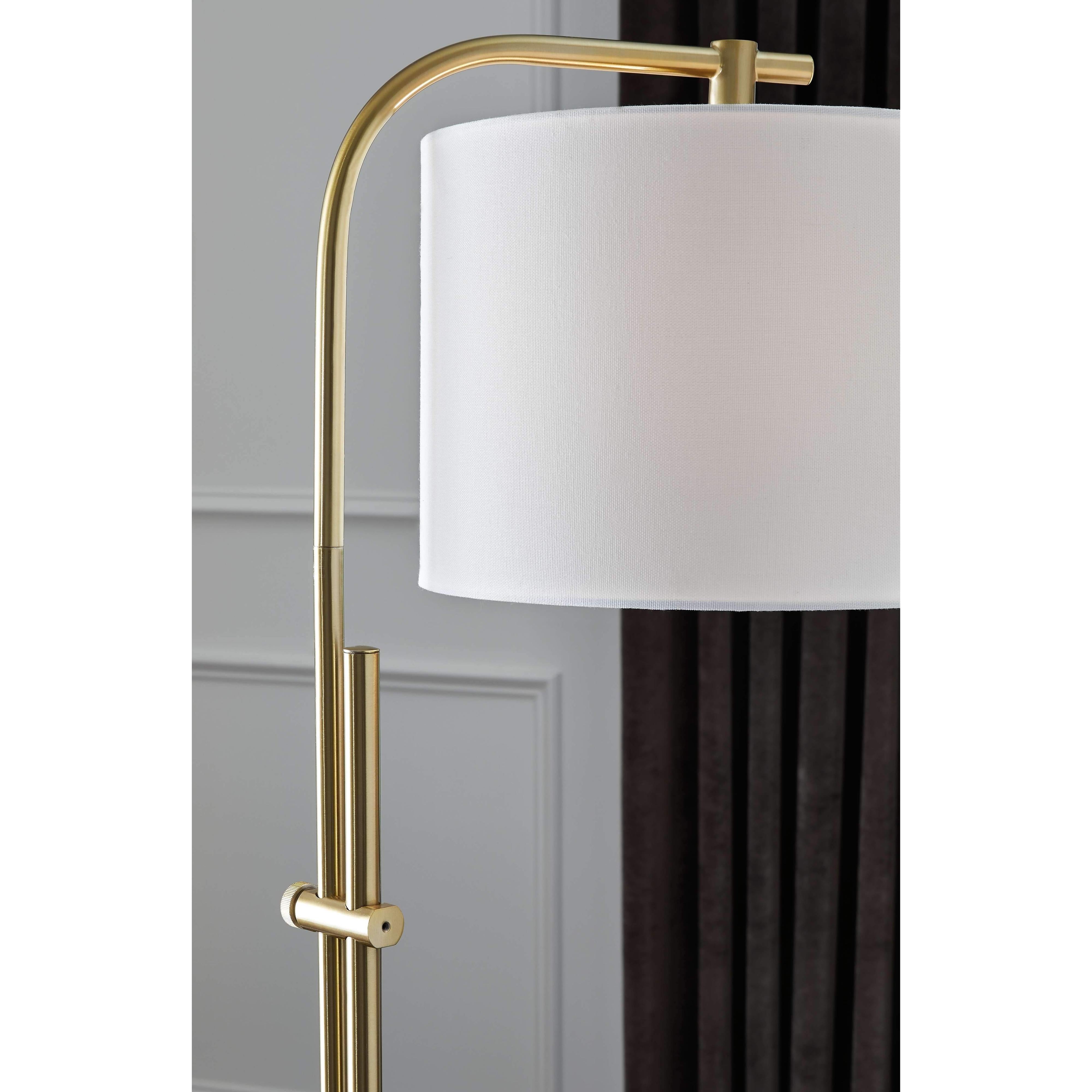 This floor lamp features a beautiful brass-tone finish that adds a rich, golden accent to your living space. The lamp arm is elegantly curved with soft edges, and is adjustable to provide targeted illumination. Topped off with a crisp white drum shade, this lamp provides a subtle and appealing contemporary design wherever placed.