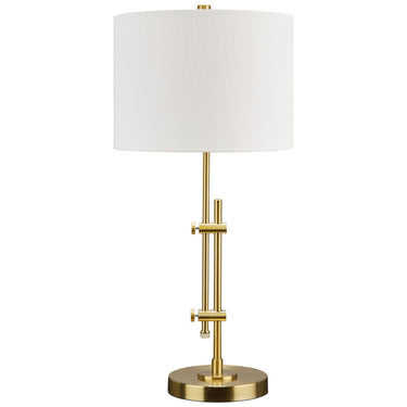 This metal desk lamp features a beautiful brass-tone finish that adds a rich, golden accent to your living space. The lamp is elegantly engineered, and is adjustable to provide targeted illumination. Topped off with a crisp white drum shade, this lamp provides a subtle and appealing contemporary design wherever placed.