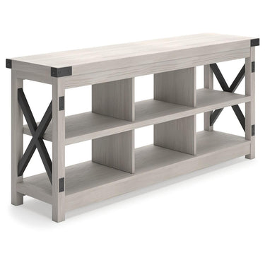 With its whitewash finish and six open storage areas, this TV stand offers a transitional style that fits everywhere from urban chic to modern farmhouse settings. Crossbuck elements on each end in a contrasting black accent color add simple charm.