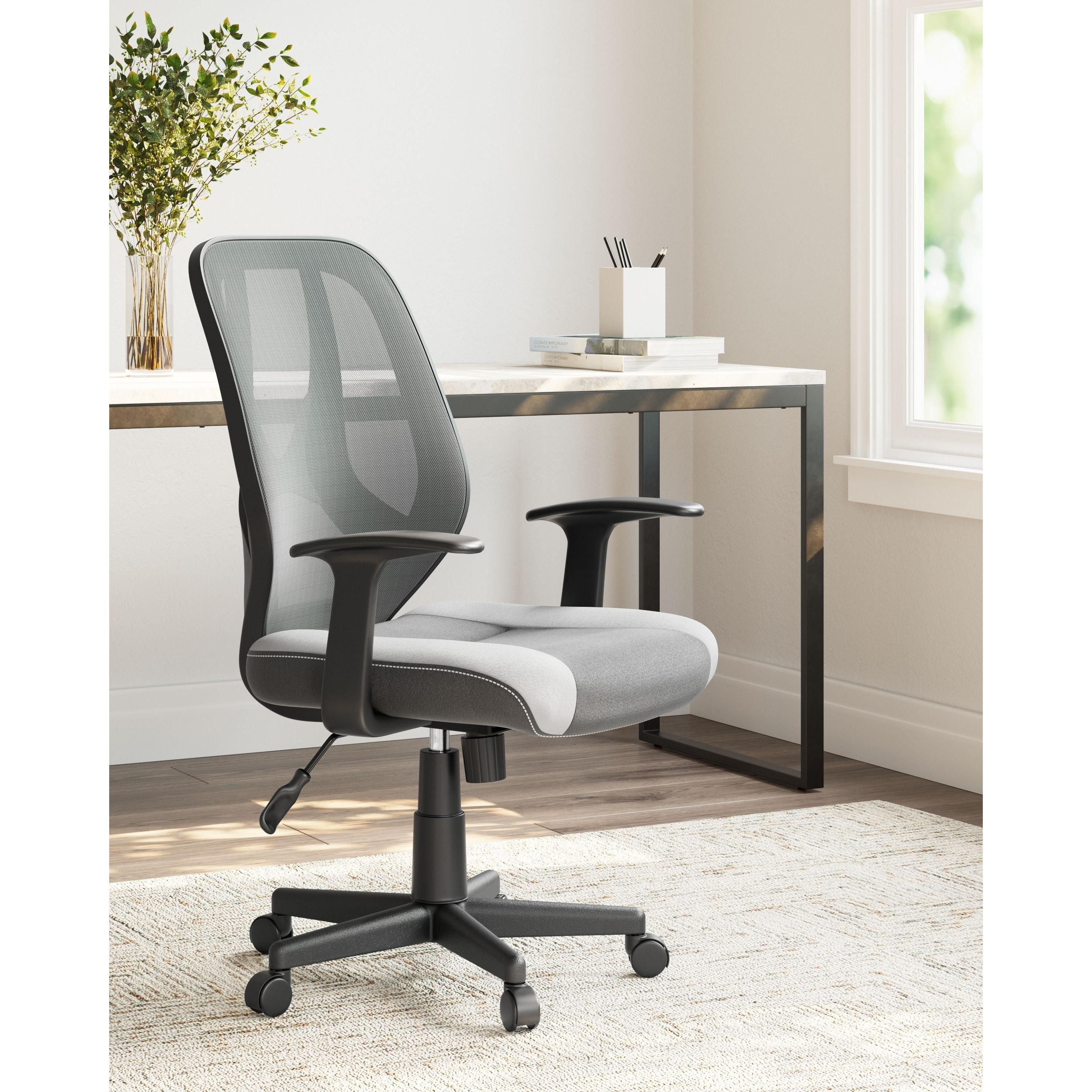 The finishing touch to any home office, this contemporary office chair offers comfort and style. The chair features a mesh back and fabric seat with fixed arms for extra comfort. Casters deliver effortless mobility, while the adjustable height mechanism allows you to find your ultimate relaxation position. With a black mesh back, this chair pairs perfectly with any space.