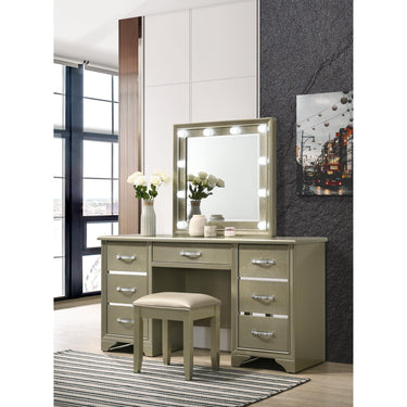 Elegant, clean lines elevate this glamorous vanity dresser and mirror set, making it a striking addition to a bedroom changing area or spacious walk-in closet. covered in a champagne finish, this vanity and mirror combo offer up a regal vibe fit for celebrity status. crystal encrusted chrome pulls adorned on each of the spacious drawers add the right amount of sparkle and shine. adding a subtle texture each of the seven drawer front panels is a stingray embossed material, accented by an inset mirror trim. get your glow up effortlessly with the accompanying framed mirror, surrounded by 10 led bulbs that give it a vintage hollywood style.
