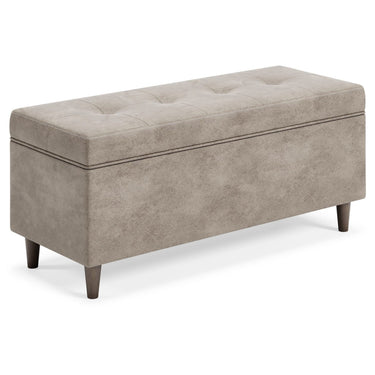 Clean and classic in design, this storage bench has a welcoming sense of style. Mastering the art of simplicity, it wows with light beige faux leather and turned legs. A hinged seat top opens to reveal handy storage. Whether this bench is making an entryway, mudroom or living room more inviting, it's the pinnacle of form and function.