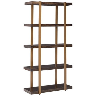 Make a statement with this five shelf bookcase. The dark brown finished wood lends an urban touch, while the antiqued brass-tone finished frame creates a contemporary feel. The layered structure of the bookcase allows ample space for all of your display and storage needs.