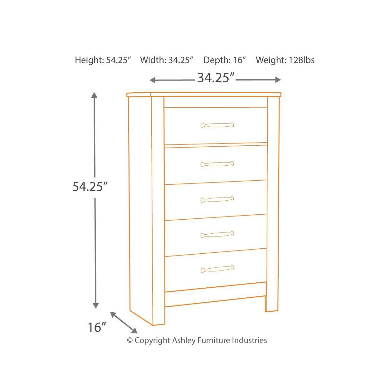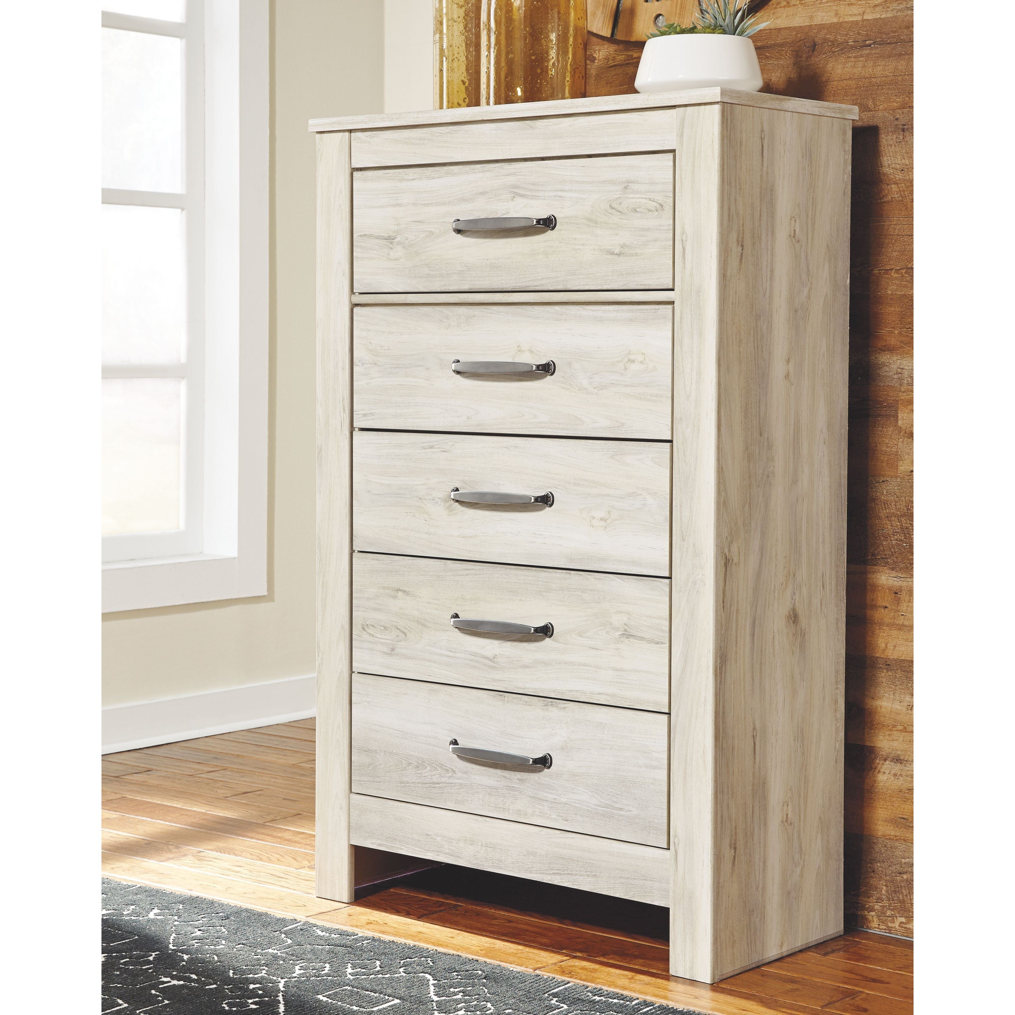 Your bedroom isn't just a room. It's a canvas. Express your farmhouse style with this chest of drawers. Wispy white finish over replicated oak wood grain brightens up the space with charm. Brushed nickel-tone handles with black edging finesse the piece with a bit of shine. Drawers are spacious and lined with faux linen laminate to hold your belongings with care. This clean-lined profile is the perfect authentic foundation for inviting decor.