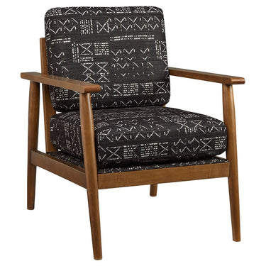 This accent chair offers a perfect blend of style and comfort for your living space. A charcoal printed upholstered seat and back complement the design and invite you to sit back and relax.