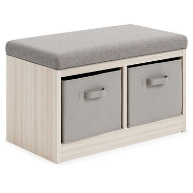 Sit and store in style. This storage bench is topped with a cool gray cushion for a soft touch. Its removable fabric baskets are perfect for storing cold-weather essentials or keeping clutter under wraps. A light tan finish cleanly completes the look. Works wonders in your child's bedroom or play space.