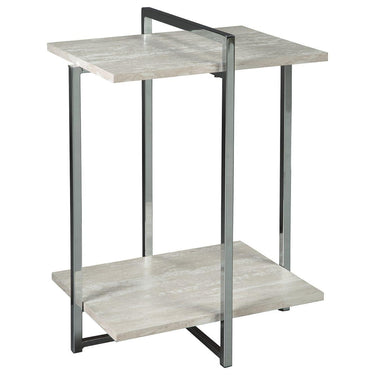 Contemporary style gets a modern attitude in this side table. The replicated travertine stone shelf offers chic sophistication while the box design of the metal frame creates negative space to offer the illusion of more room.