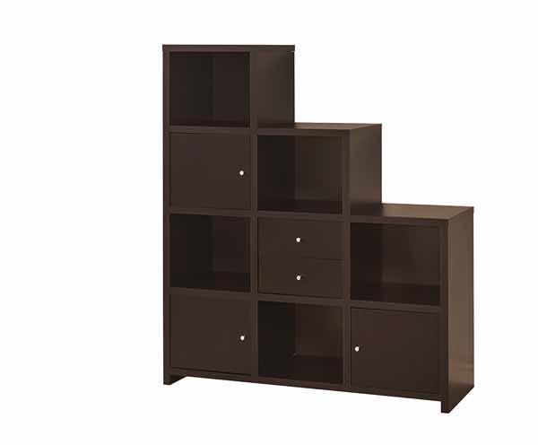 Art meets architecture to deliver a stunning and useful home accessory. with a rich cappuccino finish, this bookcase highlights a fun staggered silhouette mimicking a staircase. perfect for both a bedroom and a main living space, it offers a variety of options for storage and display. find open room on three top surfaces and in five open compartments. tuck away essentials behind three doors and in two center drawers with smooth euro glides.