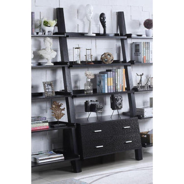 Elevate the style workspace with three-ladder style bookcases. coming as a set, the bookcases are bound to bring plenty of organizational options for your living room or large home office. a stylish aged walnut finish makes this a versatile addition to your space. find plenty of areas to display and organize your books, decor and small house plants. meanwhile, a small tabletop and four storage drawers offer an extra area for displaying items and concealing essentials.
