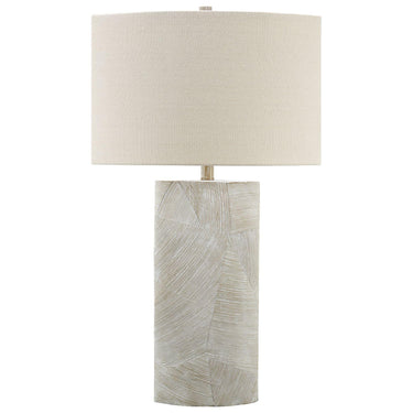 The rustic natural beauty of this table lamp makes it perfect for illuminating any room. Its brown and ivory resin base is complemented with a straight-side oval hardback shade. Low profile yet elegant, this lamp makes a gorgeous accent for contemporary spaces.