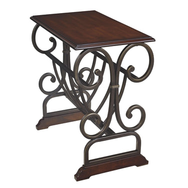 Form and function coexist beautifully in this chairside end table. Fanciful metalwork seamlessly integrates a magazine rack into the table frame. Cherry-tone top and feet make a richly traditional statement.