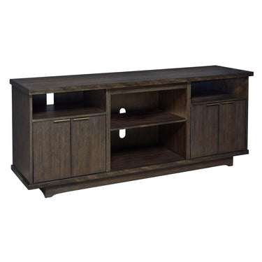 Brazburn TV stand with fireplace option is hearty, rustic style simply done right. It's expertly crafted with a mango veneer with a dark brown espresso finish. Details including a thick tabletop, open shelves and double door side cabinets to house all of your electronic needs. Enhance the Brazburn's sense of homey warmth by popping out the middle shelf and making room for the electric fireplace insert, sold separately.