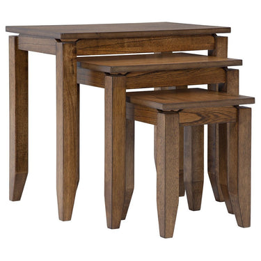 Chunky, earthy and rustically refined, this 3-piece table set includes three different sizes of light brown finished nesting tables. Space-saving nesting design is a smart choice on so many levels.