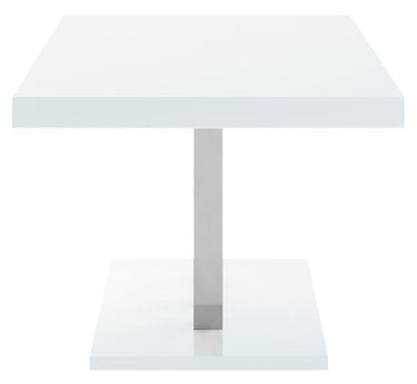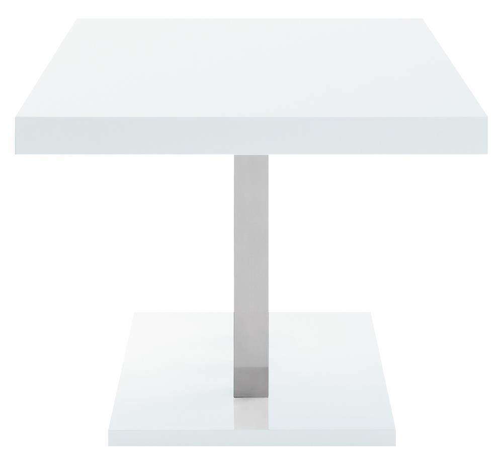 Sleek lines and smooth materials come together to create this ultra-modern dining table. designed with a spacious rectangular top in a white high gloss finish that lends a polished, formal flair, this dining table offers up a chic style to formal entertaining spaces. mirroring the top is a flush base, offering extra support and stability. with a pedestal-like design, the top and base come together with a trio of polished stainless steel supports in a lustrous and gleaming chrome finish. place this dining table in a dining area for a jaw-dropping look.