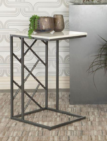 Slide this contemporary accent table up to a seating arrangement to keep a beverage or snack close at hand. this c-shape cantilever table is designed with a flush base that supports a rectangular table made of a white marble top that lends a classical flair and glam touch. spacious enough for a tablet or laptop as well, this snack table is supportive and stable, built with an iron frame that features slim vertical supports and a crisscross design along the side for a charming design element. keep this table near a sofa or sectional to create an additional workspace for guests and company. or keep it in a home office as a second workstation.