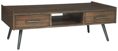 Retro yet relevant. This coffee table is a great case of mid-century influence with cool, contemporary flair. Ultra-linear tabletop is supported by canted round metal legs for a signature look that reflects your eye for beautiful things.