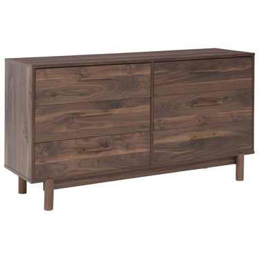 At the intersection of industrial cool and chic sophistication you'll find this dresser. The rich brown finish over replicated walnut wood grain and burnished goldtone handles offer an authentic touch that plays well any way you style it. Simple and elegant in its design, this piece keeps your home decor grounded while elevating your modern style.
