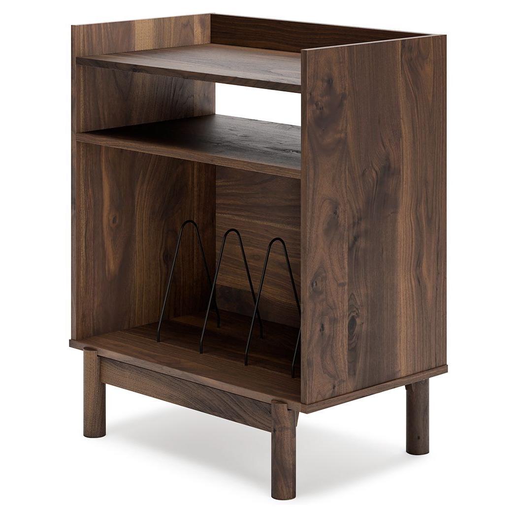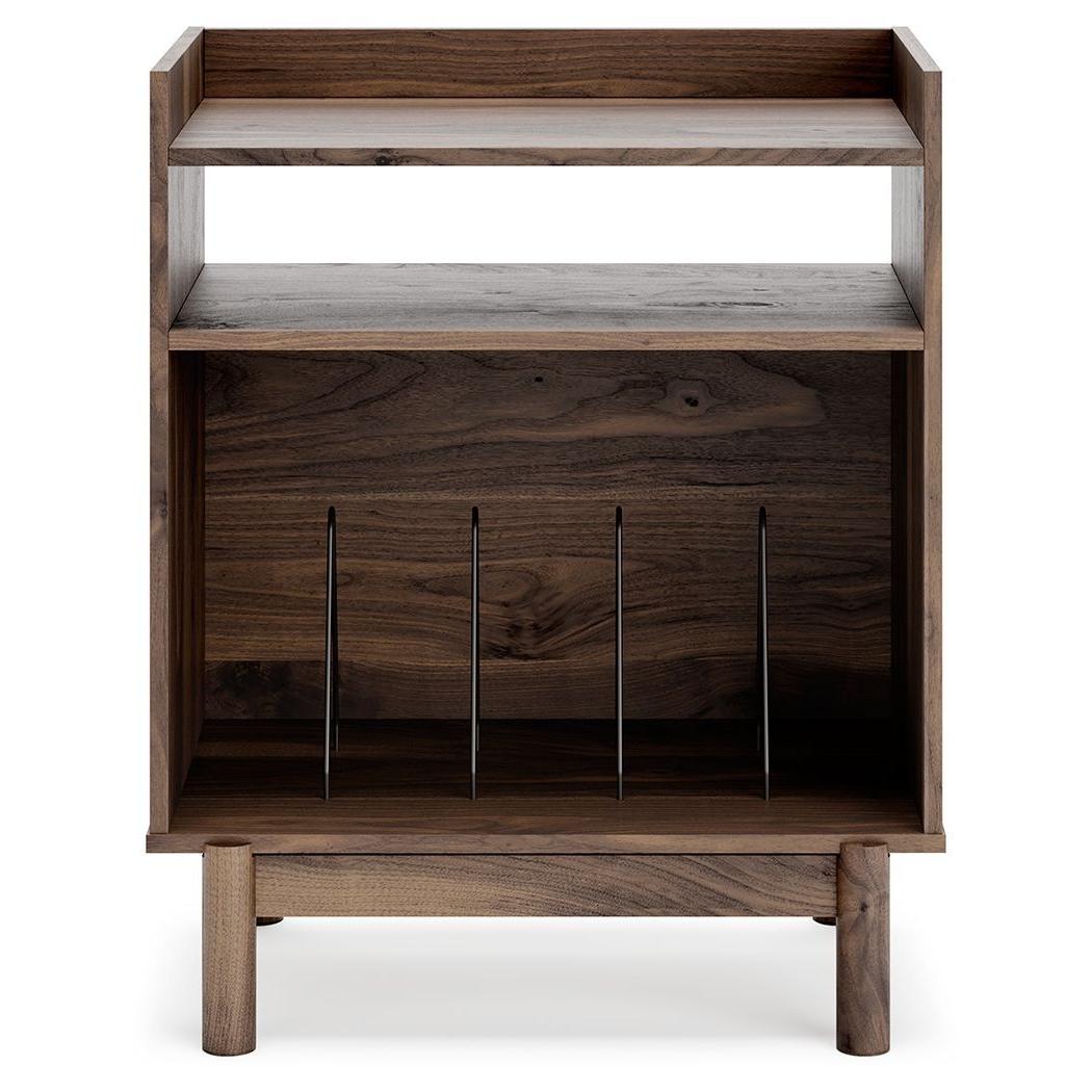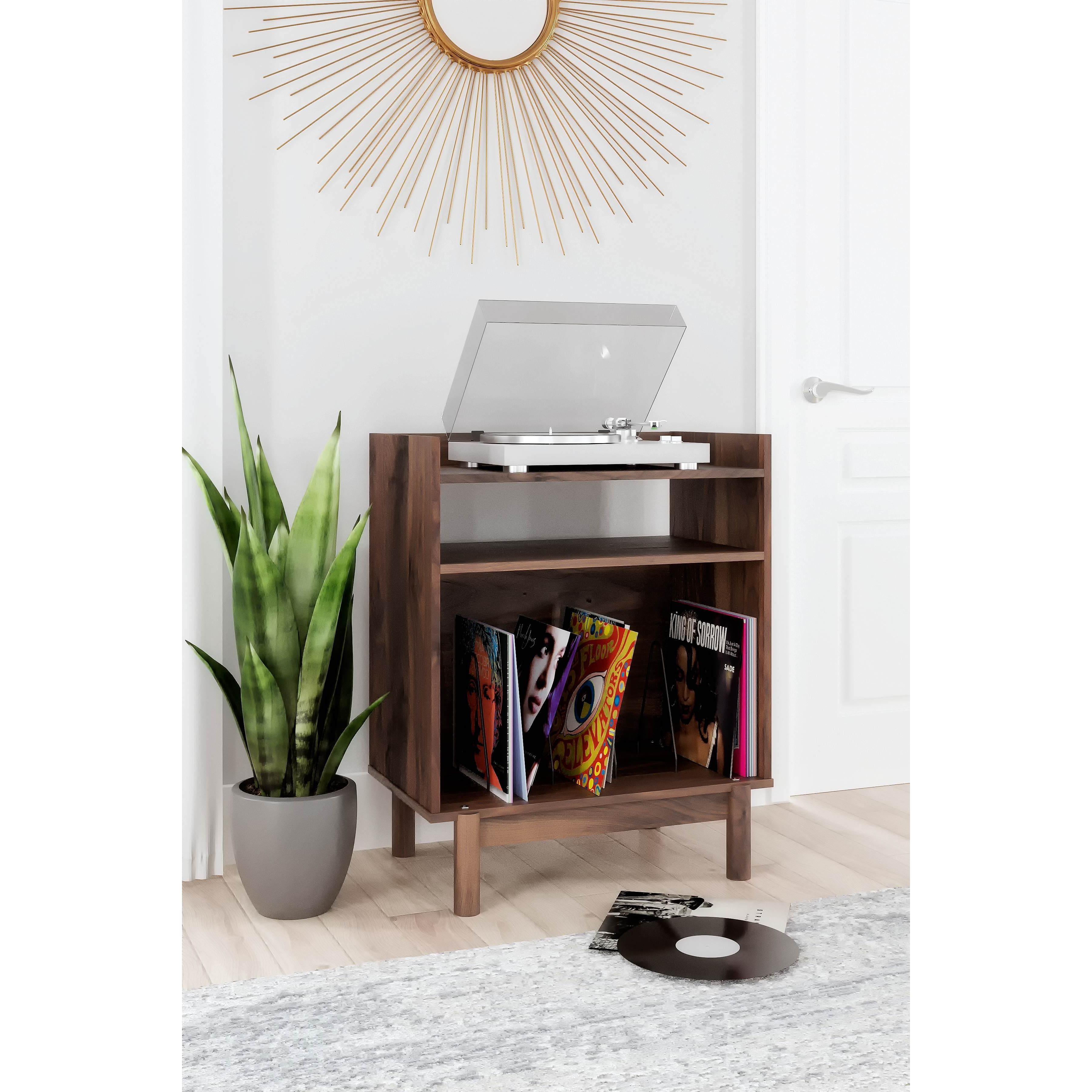 At the intersection of industrial cool and chic sophistication you'll find this turntable accent console. Its sturdy surface is an ideal resting place for your record player and speakers. Store and display your vinyl collection with open shelving and black finished dividers. The rich brown finish and cylindrical legs bring modern style to this retro-inspired piece.