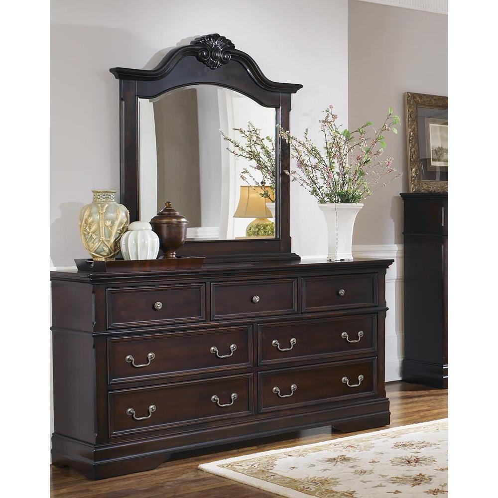 Lengthen even the smallest of rooms with this classic european-inspired mirror. create a stunning visual with the rich and warm cappuccino finish. clean lines with raised edges create a delicate frame that celebrates traditional design. featuring a sharp and elongated curve topped by crowned molding and carved details, the top of the mirror adds refined balance above a dresser. open up a room and reflect light with the novelty silhouette.