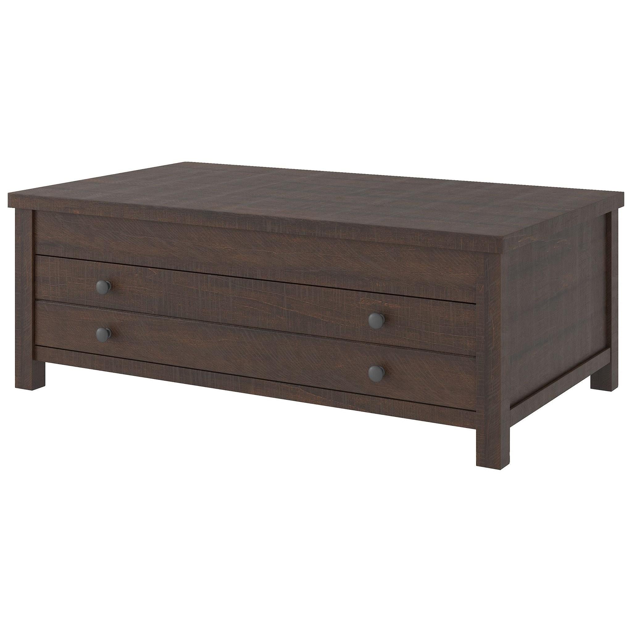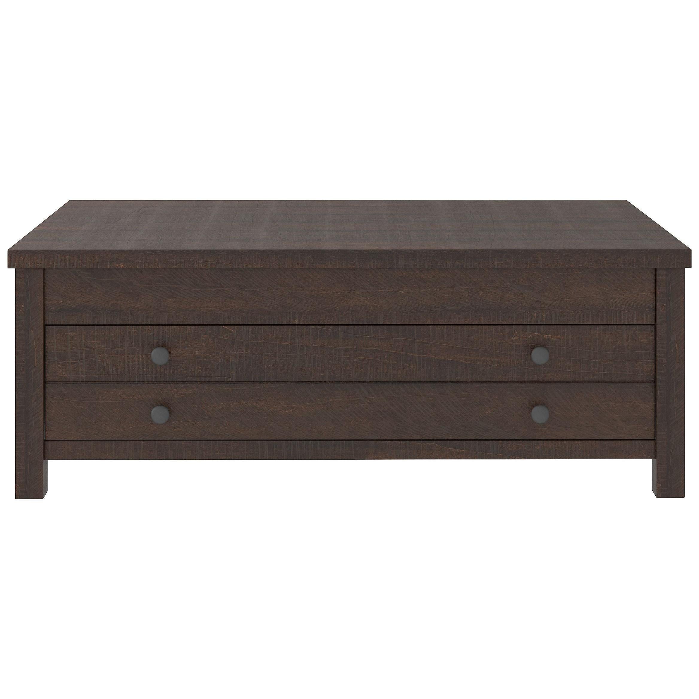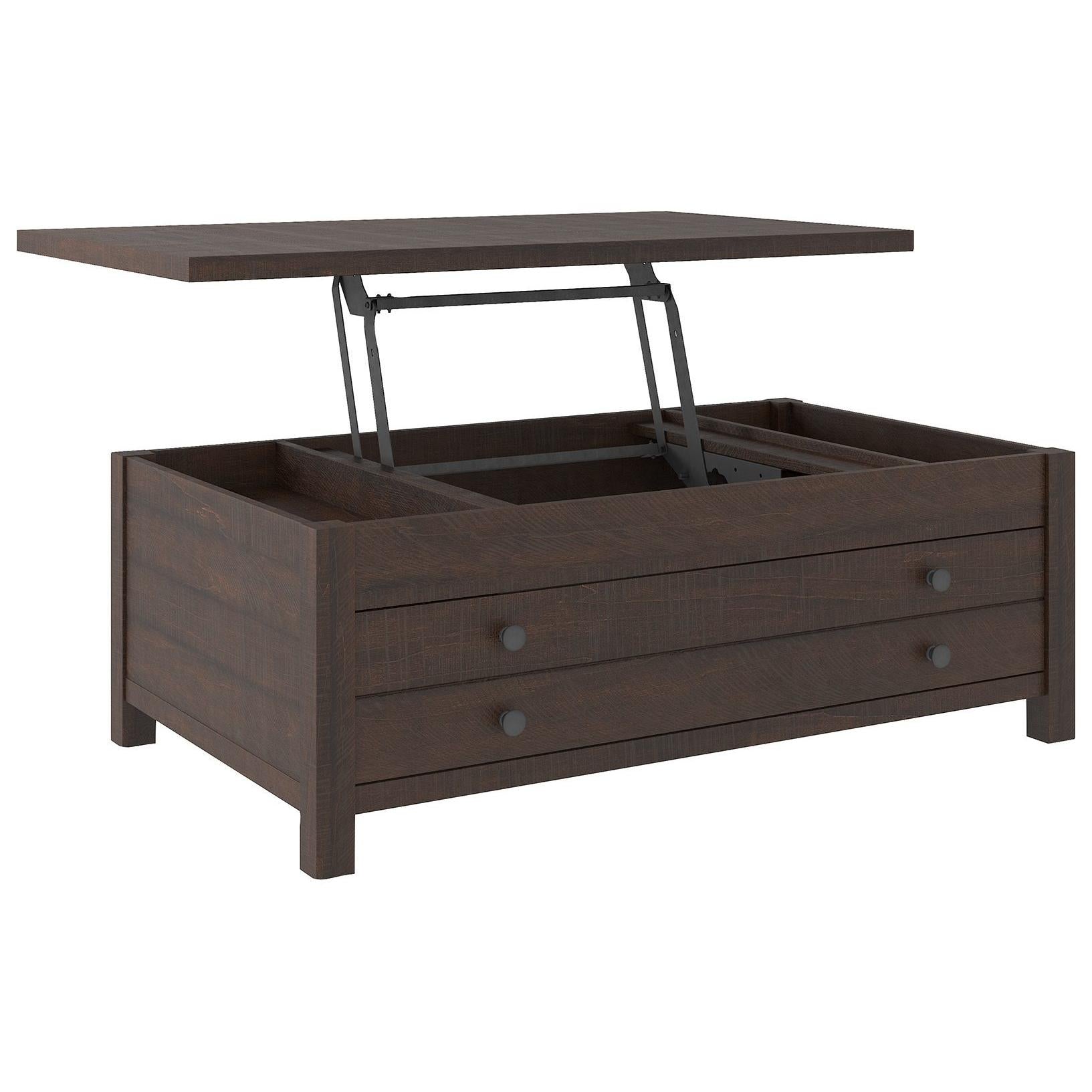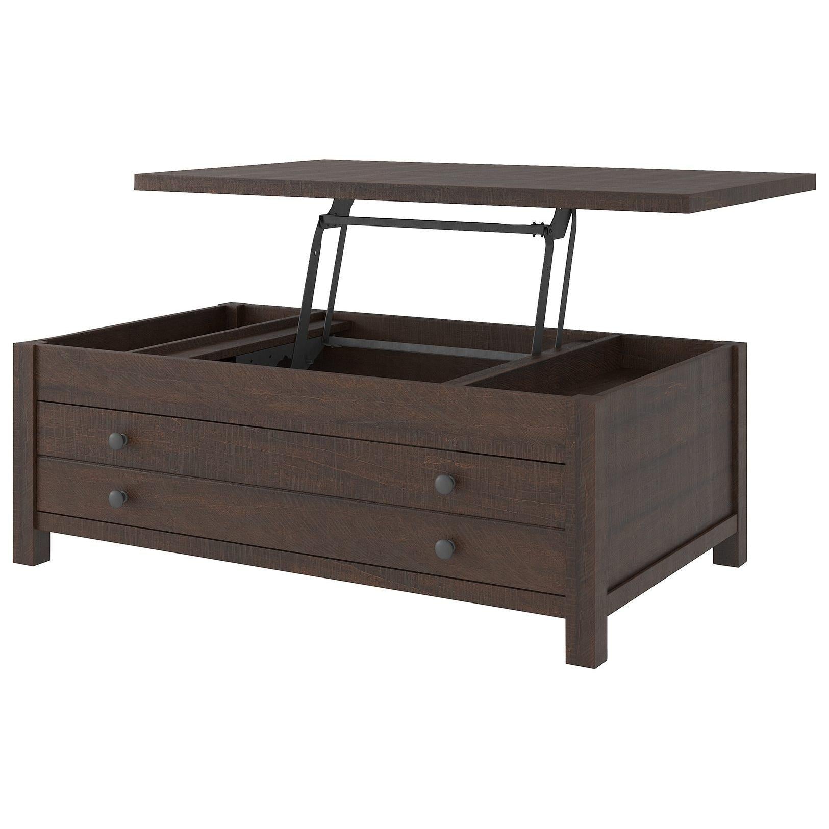 Raise the bar on modern farmhouse design with this lift top coffee table. Sporting a rough-sawn wood grain effect, this table's handy spring-loaded mechanism brings the tabletop closer to you. This versatile table makes it easier than ever to eat, work or play from the comfort of your sofa.