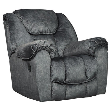 Sometimes seeing is believing. Rest assured this rocker recliner is every bit as indulgent as it looks. Designed to put you in the lap of luxury, this generously scaled recliner-wrapped in a wonderfully plush and practical granite gray upholstery-sports scooped pillow wrapped armrests and curvaceously cushioned head-neck support for feel-good flair.