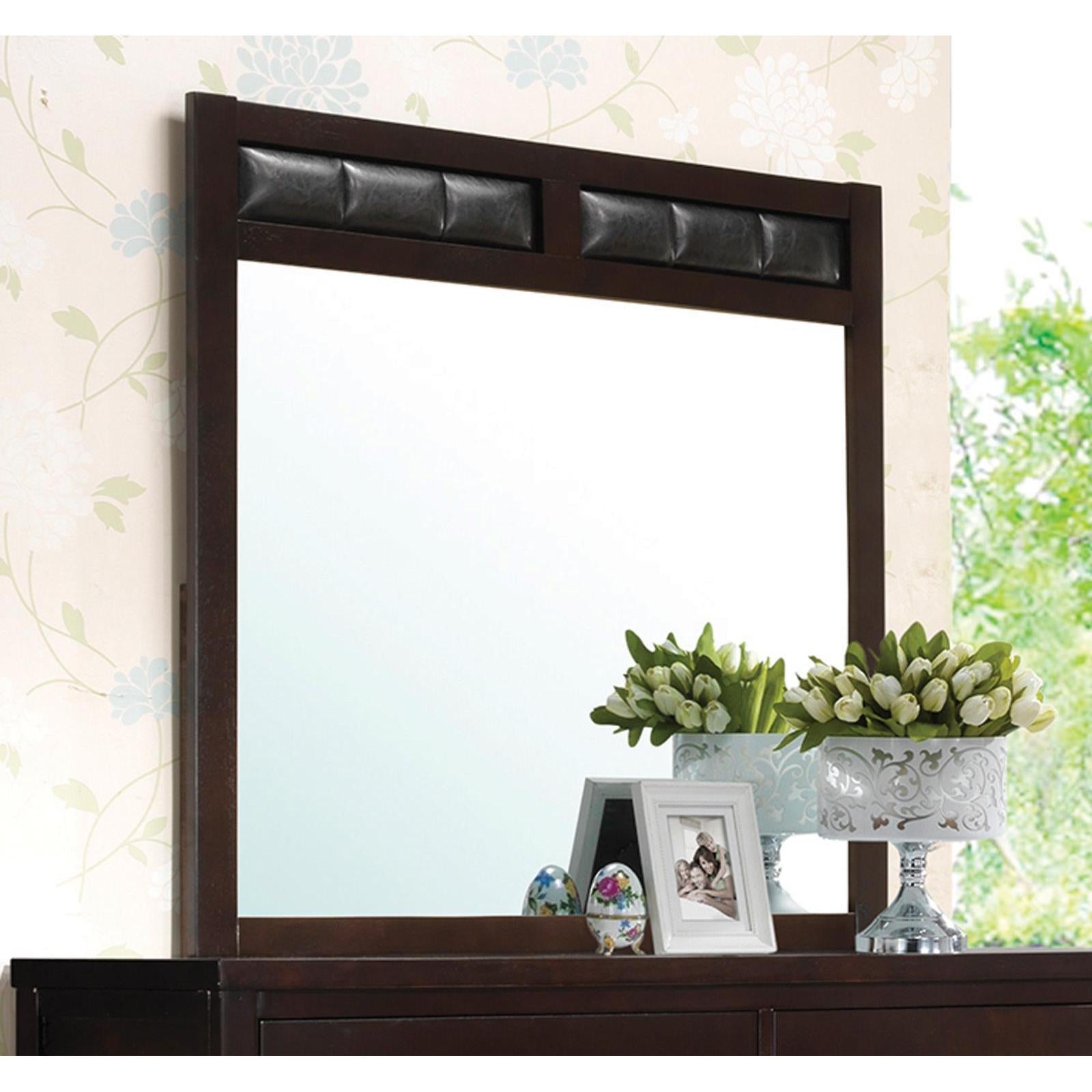 At more than three feet wide and tall, this mirror conveys an impressive presence. it has the size you want to make sure you're dressed in style from head to toe. fits perfectly on the large dresser from the same collection. what sets this mirror apart is the leatherette padding that tops the handsome cappuccino-finished frame. adds a slice of plushness to any simple yet traditionally-styled bedroom decor.