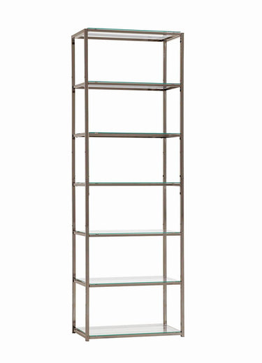 Sleek, elegant, and stylish. this bookcase brings a tasteful look to a contemporary living room or family space. built from steel with a black nickel finish, its frame is delightfully neutral and yet beautiful. clear tempered glass shelving offers a gorgeous coordinating look. display decor, books, and miscellaneous on six tiers of shelving.