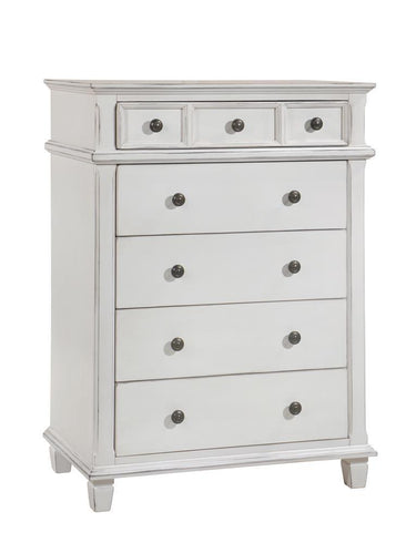 Boost your available storage space with this five drawer chest from the carolina collection. this transitional chest features a slim top drawer for all those delicate items, with four larger drawers beneath to help you stay organized. the clean lines enhanced by wood trim details and framed drawer fronts add to the charm of this transitional piece. dark finish drawer knobs provide handsome contrast against the antique white wood finish. pair with the bed from this same collection for a coordinated look that feels like a welcoming cottage.