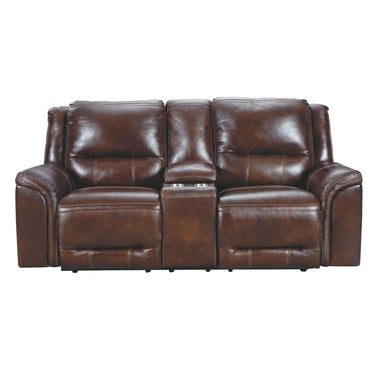 Let the luxury of this power reclining loveseat with console carry you away. Decidedly modern, with clean-lined divided back styling, this reclining loveseat entices with genuine leather covering the seating area and armrests for a supple feel. Even when you're kicking back you'll still be perfectly positioned to read or watch TV thanks to the Easy View� power adjustable headrest. And how's this for a bonus: a convenient USB charging port located in the power control, so you can recharge while you chill.