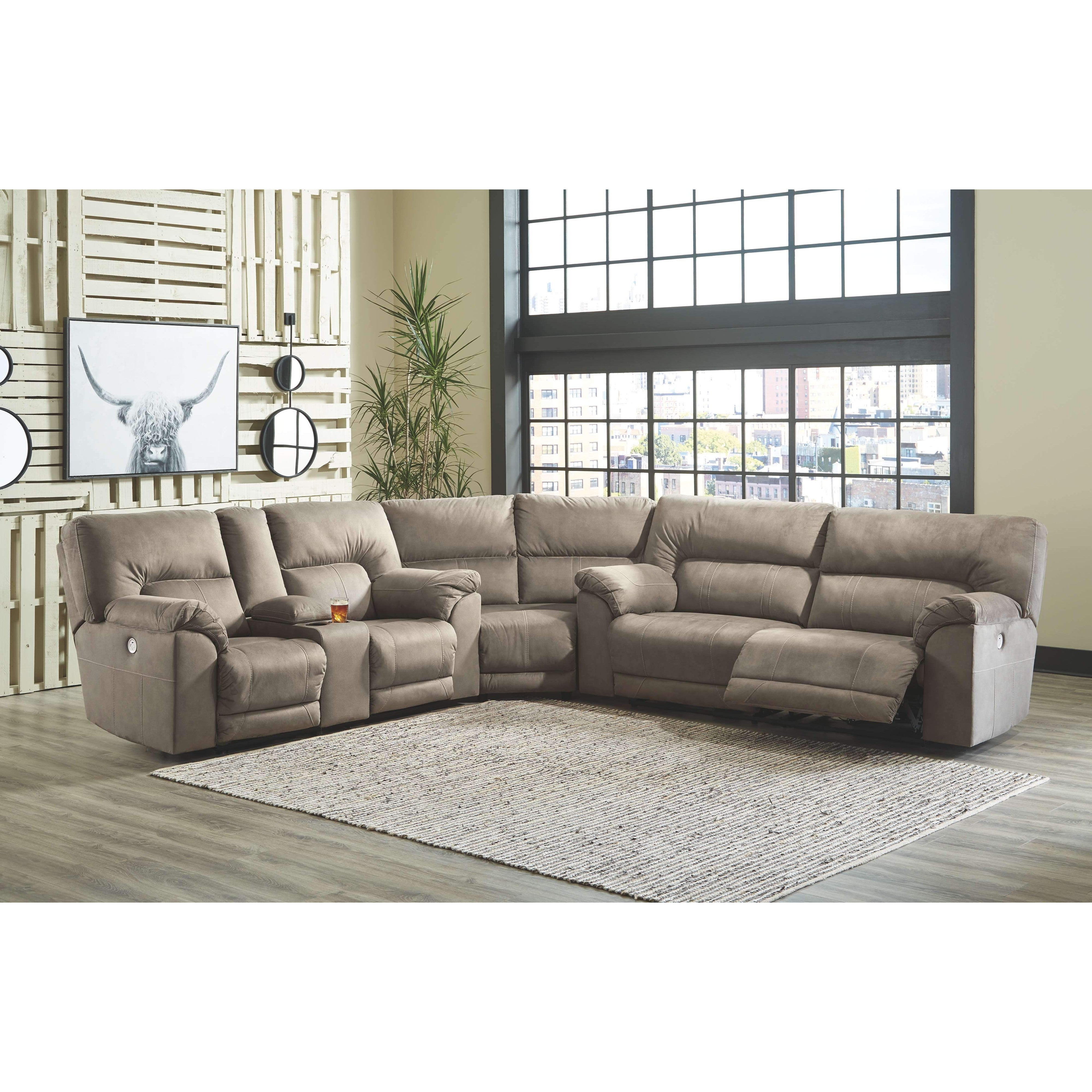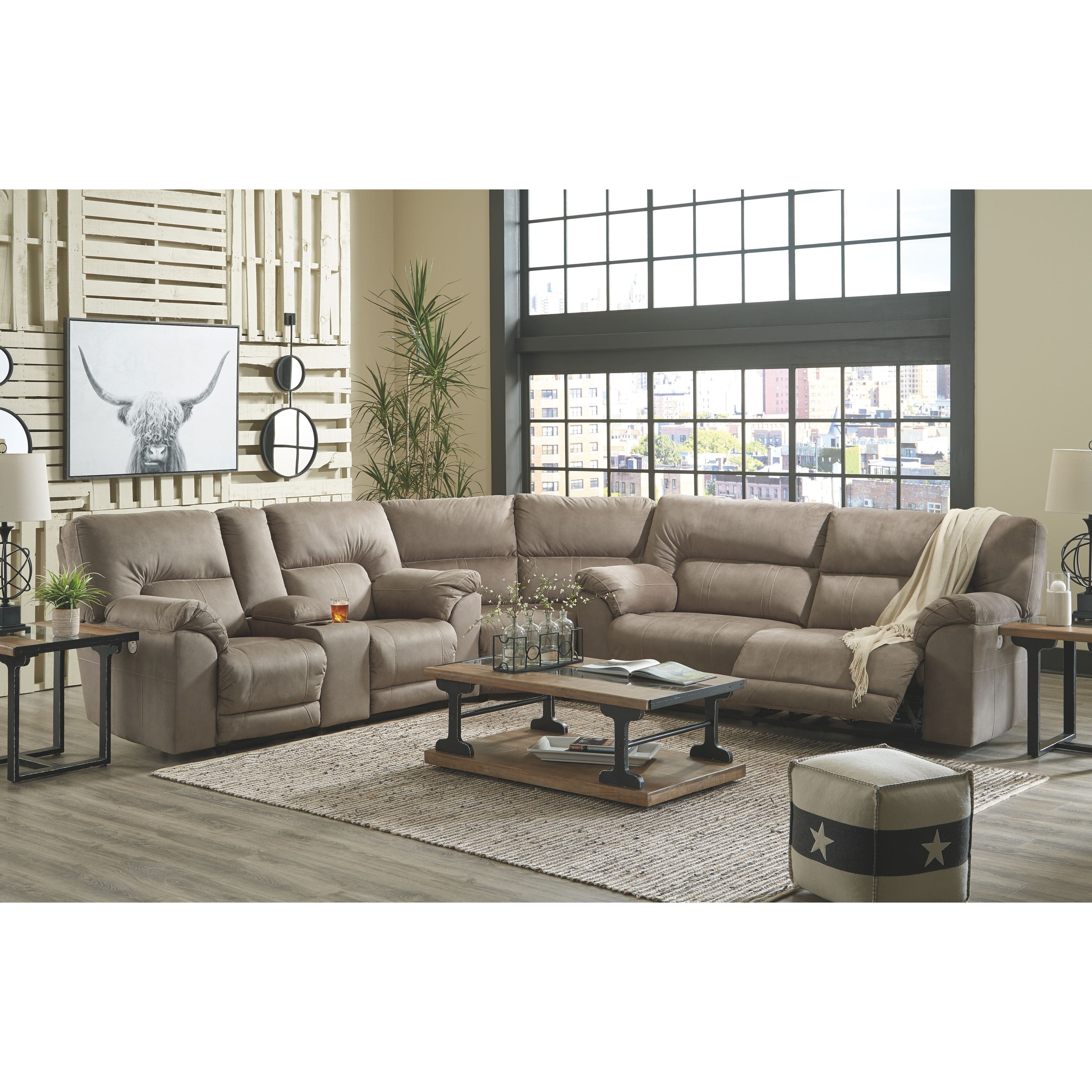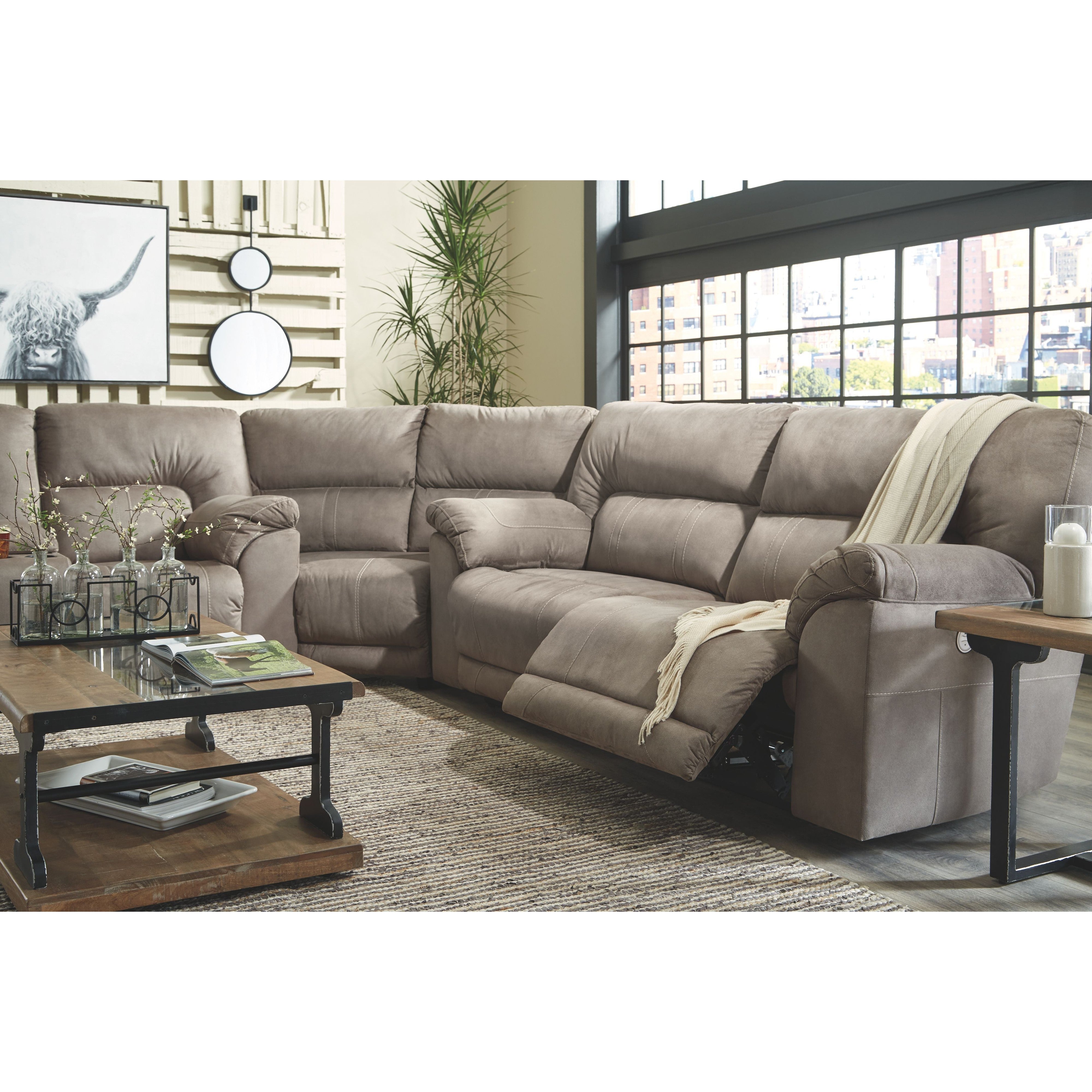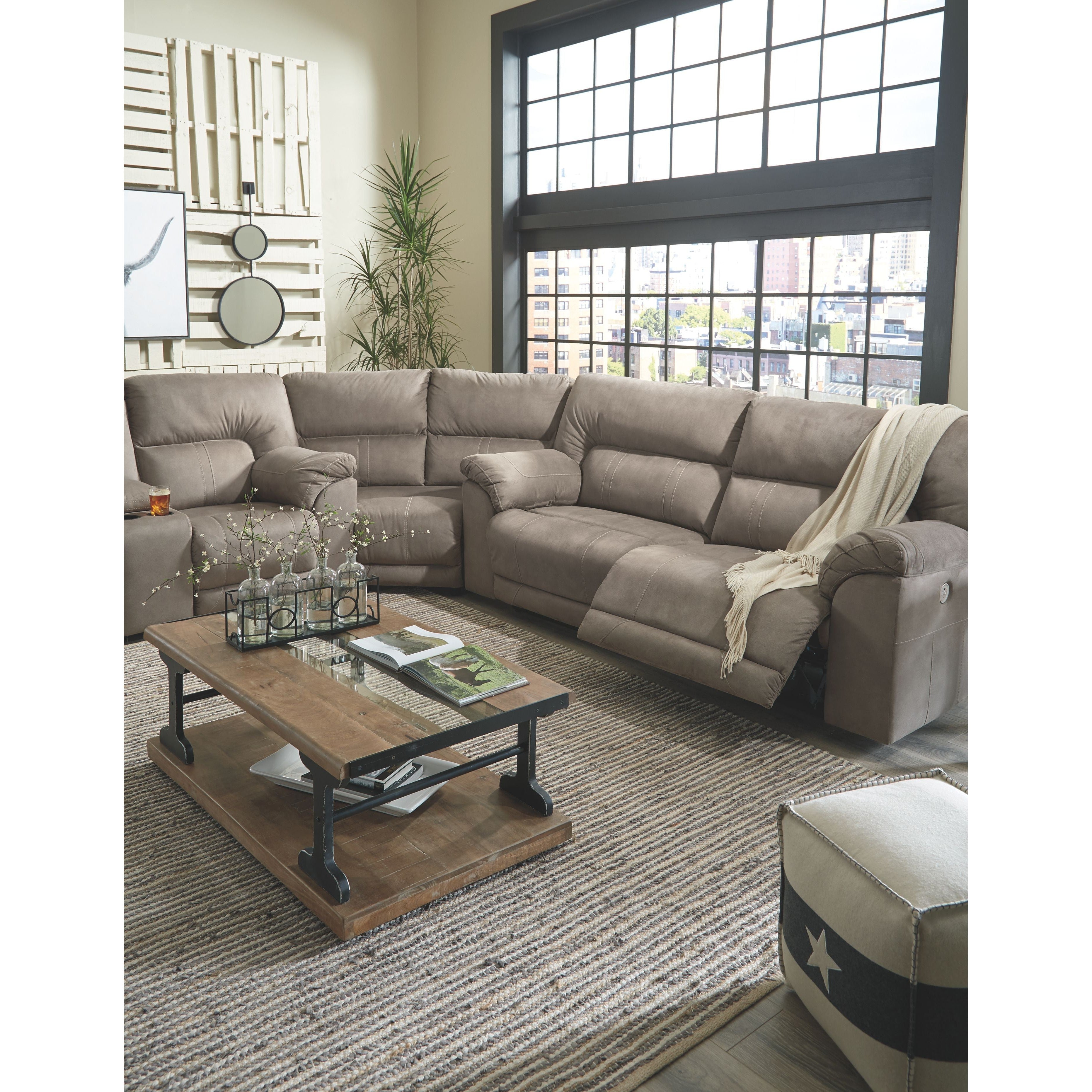 Strike a balance between the indulgent comfort you crave and the cool aesthetic you long for with this reclining sectional with power. Offering the cool look of weathered leather, the feel-good slate-tone upholstery takes neutral to new heights. Simply chic divided back tailoring, jumbo stitching and a USB port in the one-touch power control are among the finer details that make all the difference.