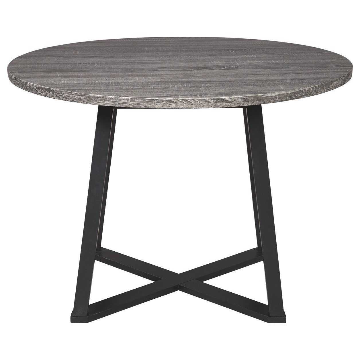 With its distinctive X-shaped metal base, this round dining table serves up a fresh twist on mid-century inspired style. Its mixed material and two-tone aesthetic are beautifully in balance. Sporting a dramatic charcoal gray hue, the top is crafted of durable melamine allowing it to weather years of family thrills and spills.