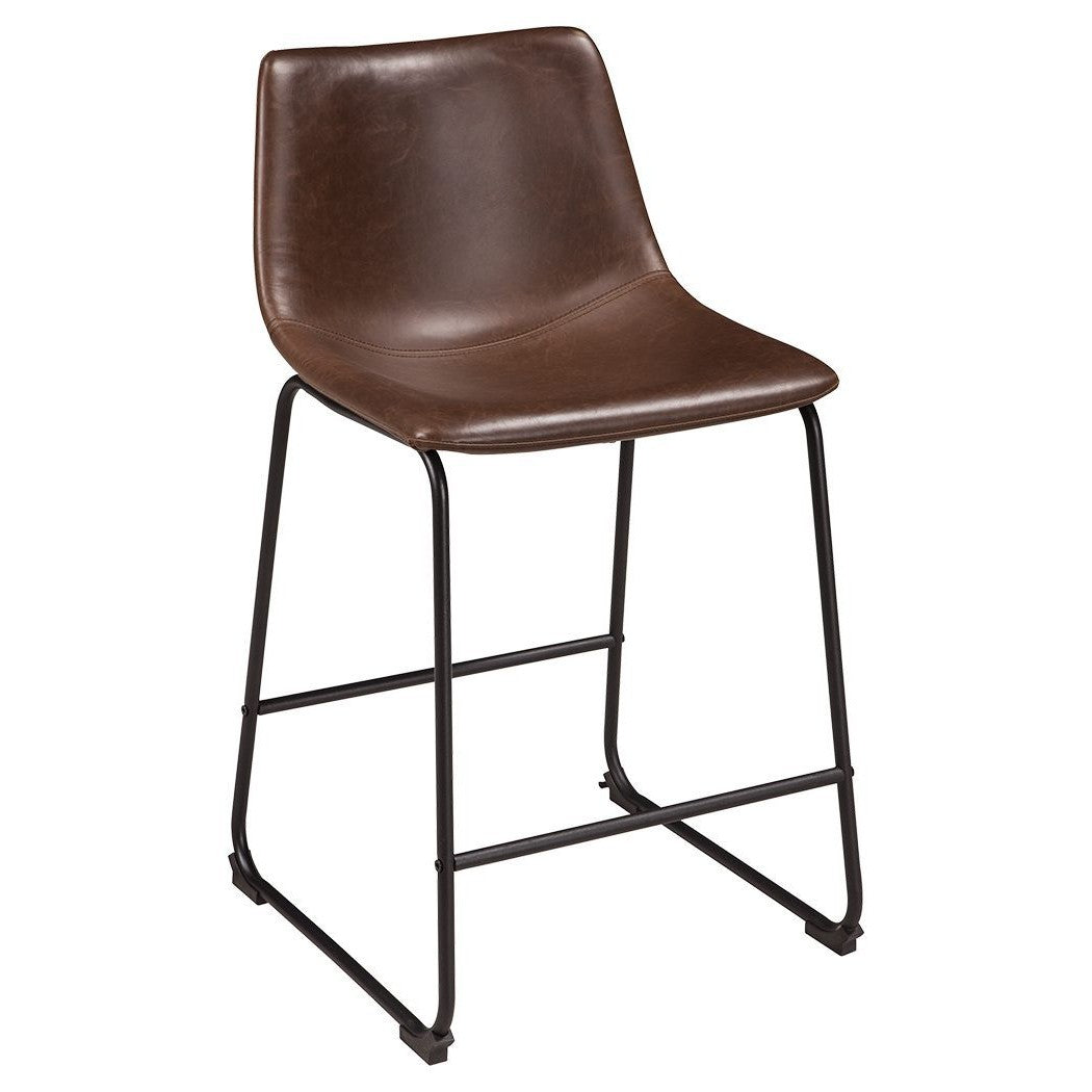 With its distinctive contoured bucket seat and tubular metal base, this upholstered bar stool serves up a fresh twist on mid-century inspired style. Practical faux leather has a charmingly vintage tone. What a timeless look for eat-in kitchens and casually cool dining rooms.