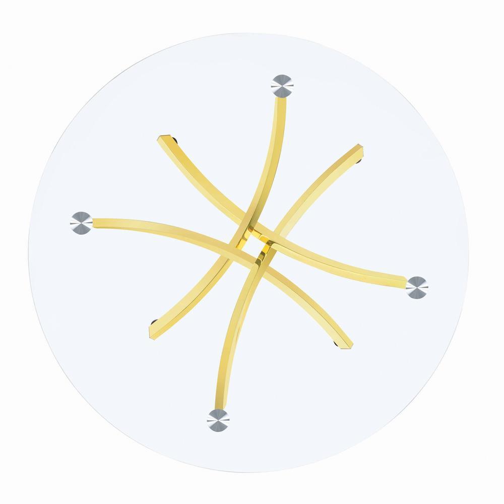 Stay on the edge of contemporary glamour. this dinette table indulges a love of clear glass and embellishes it with a radiant brass finish frame. artfully designed, its base offers eye-pleasing contoured strips. a round glass top delivers sophistication and elegance. this gorgeous table features floor-protecting discs under each leg.