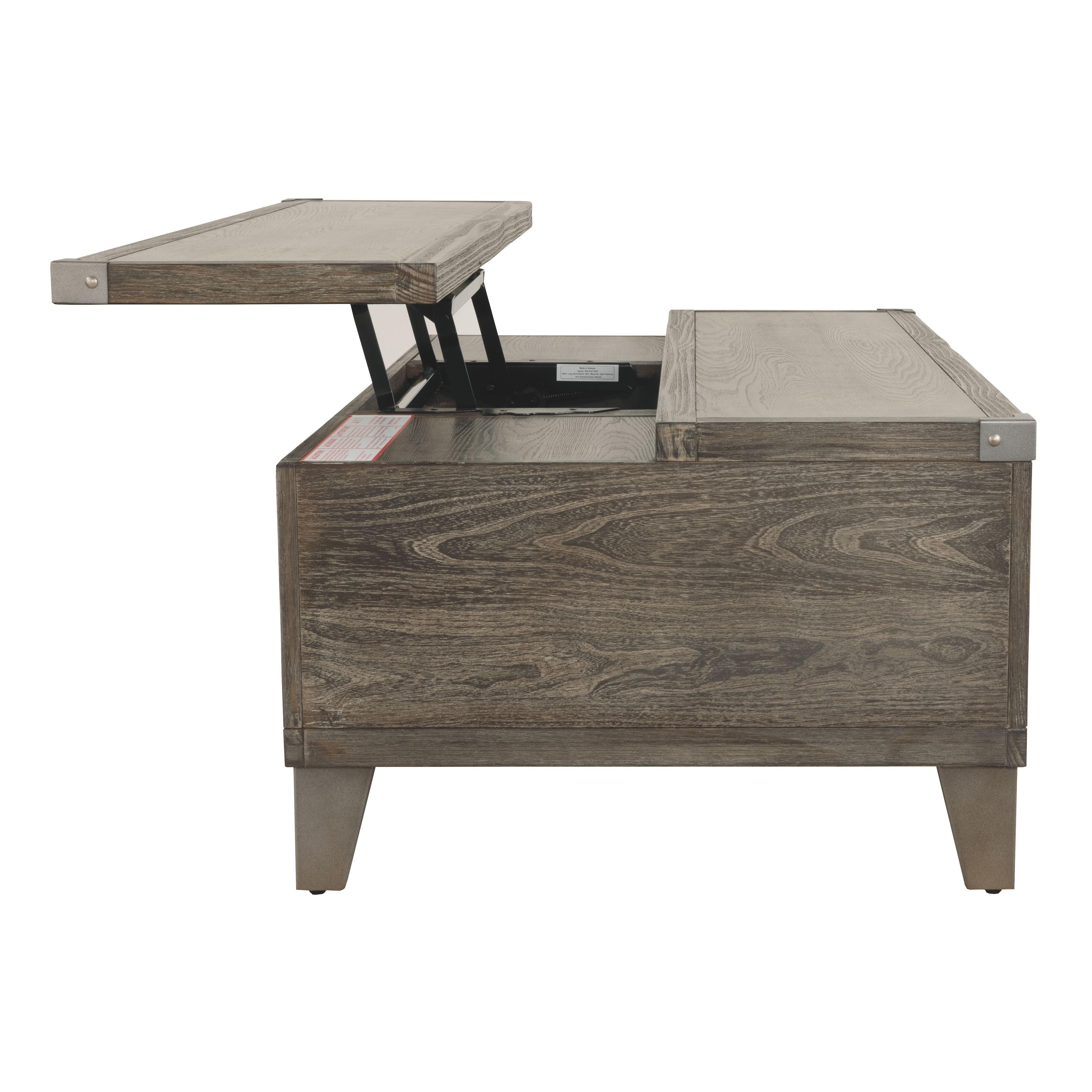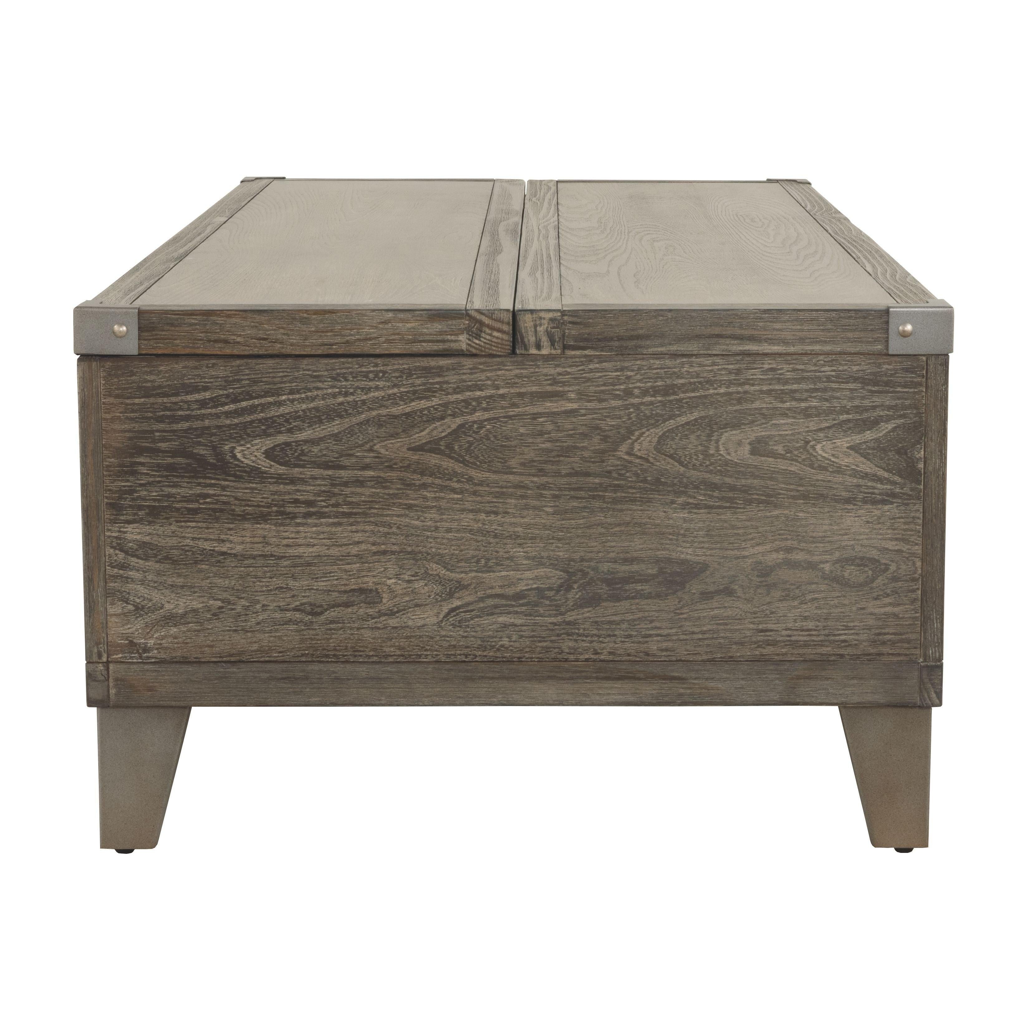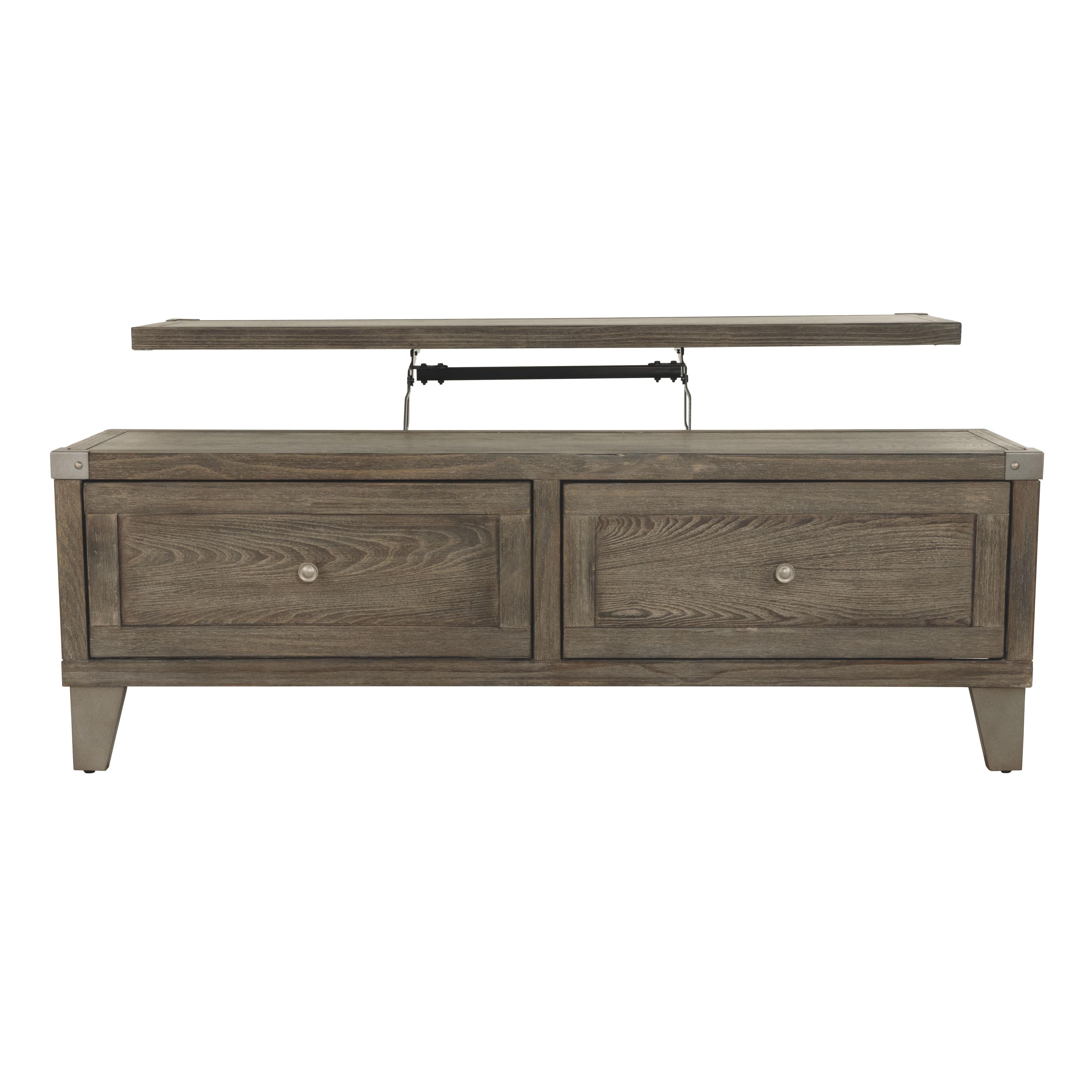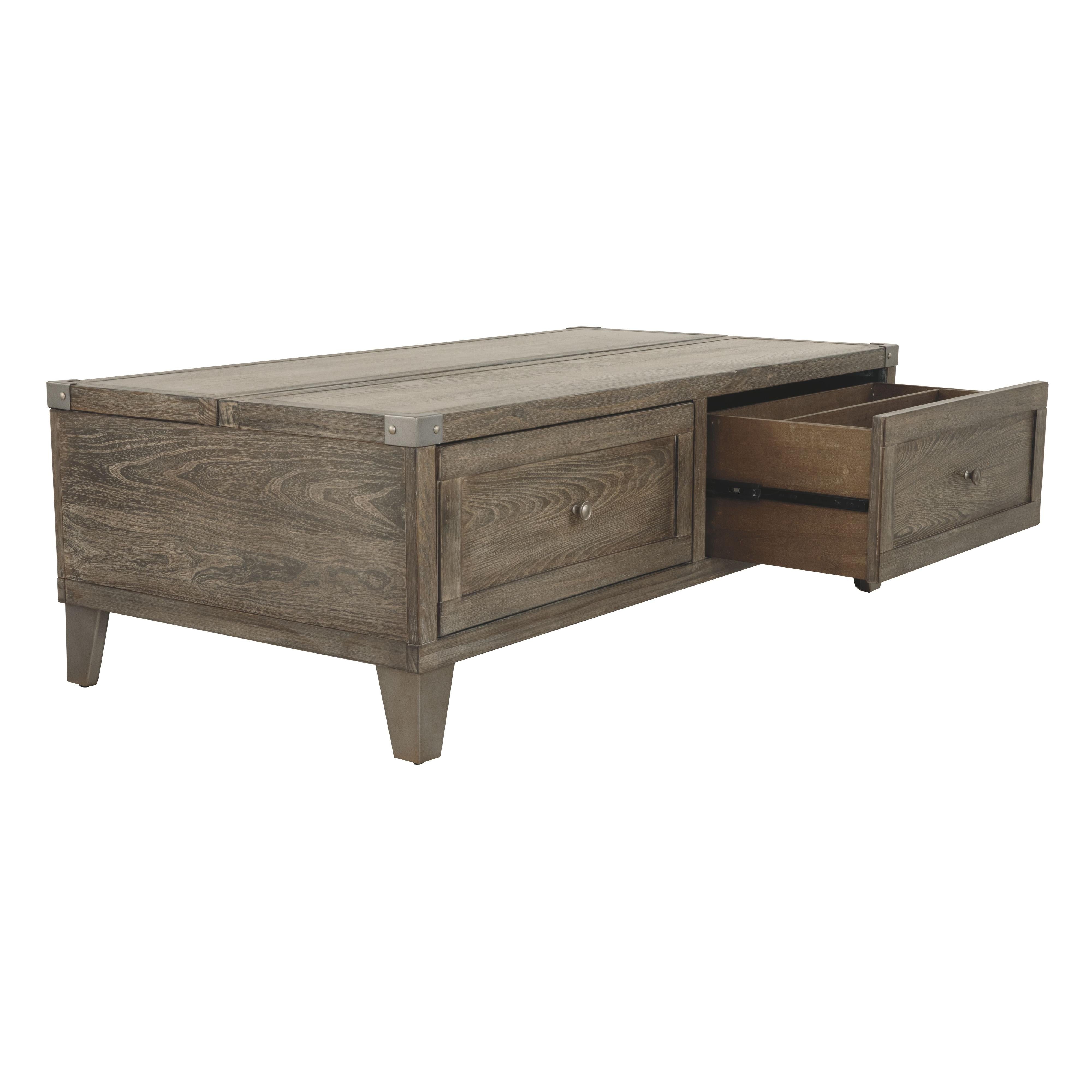 Celebrating the lighter side of modern industrial style, this lift top coffee table is the best in form meets function. The table's less-is-more weathered finish allows the natural wood grain to take center stage. Metal bracket accents and tapered metal feet in a silvertone finish are a cool yet refined touch. Split top design includes a lift top on one side and fixed surface on the other. Two smooth-gliding drawers offer plenty of handy storage.