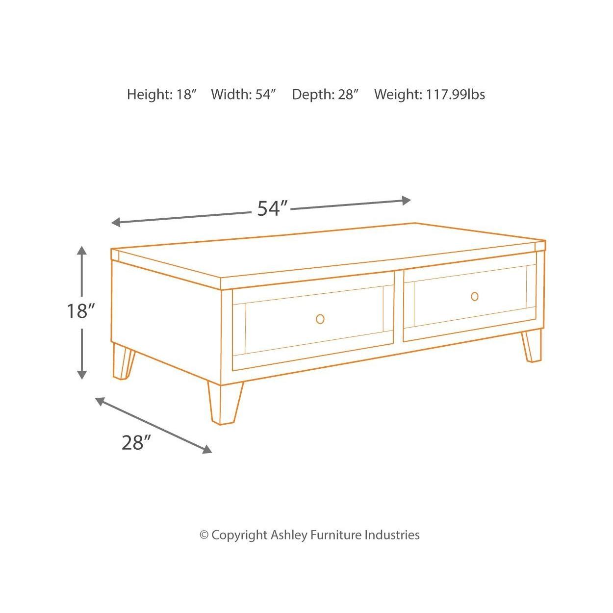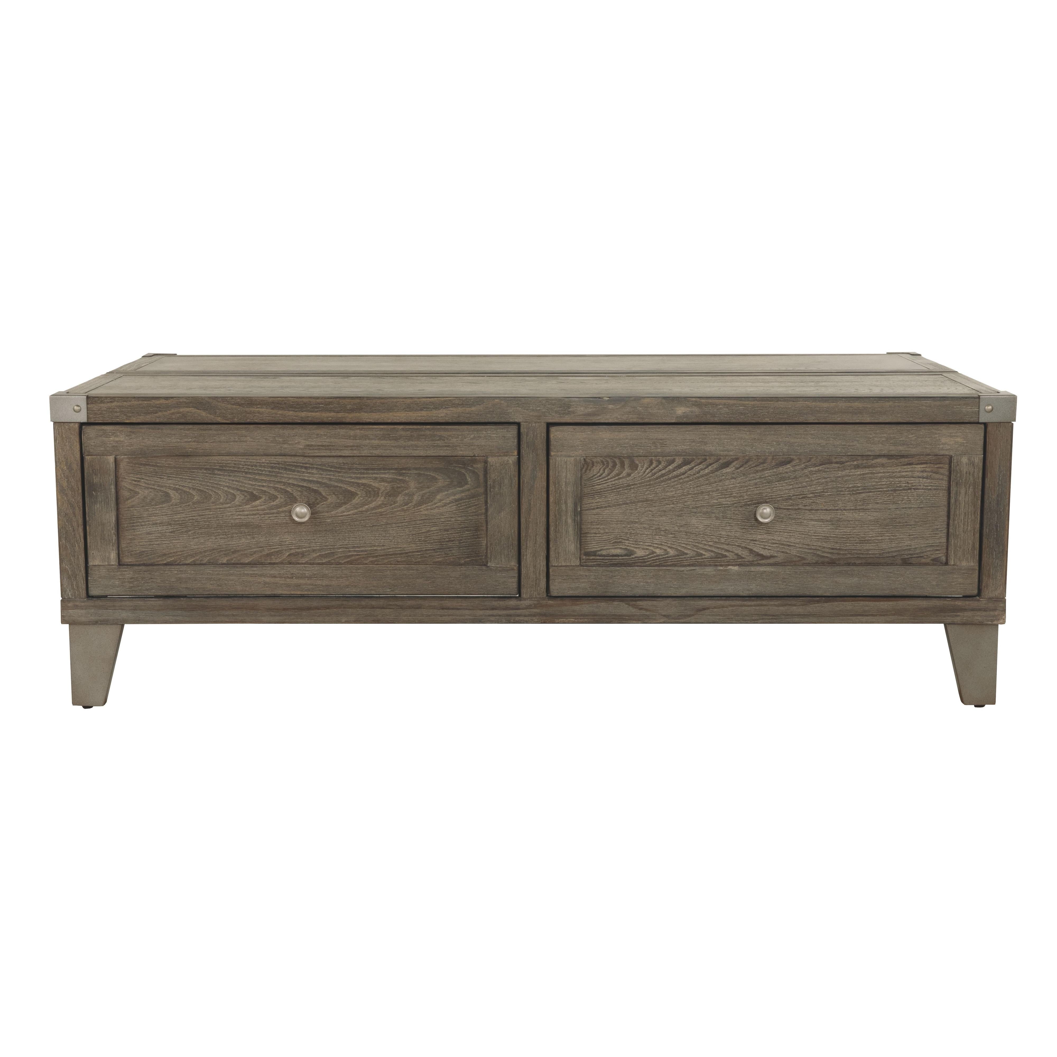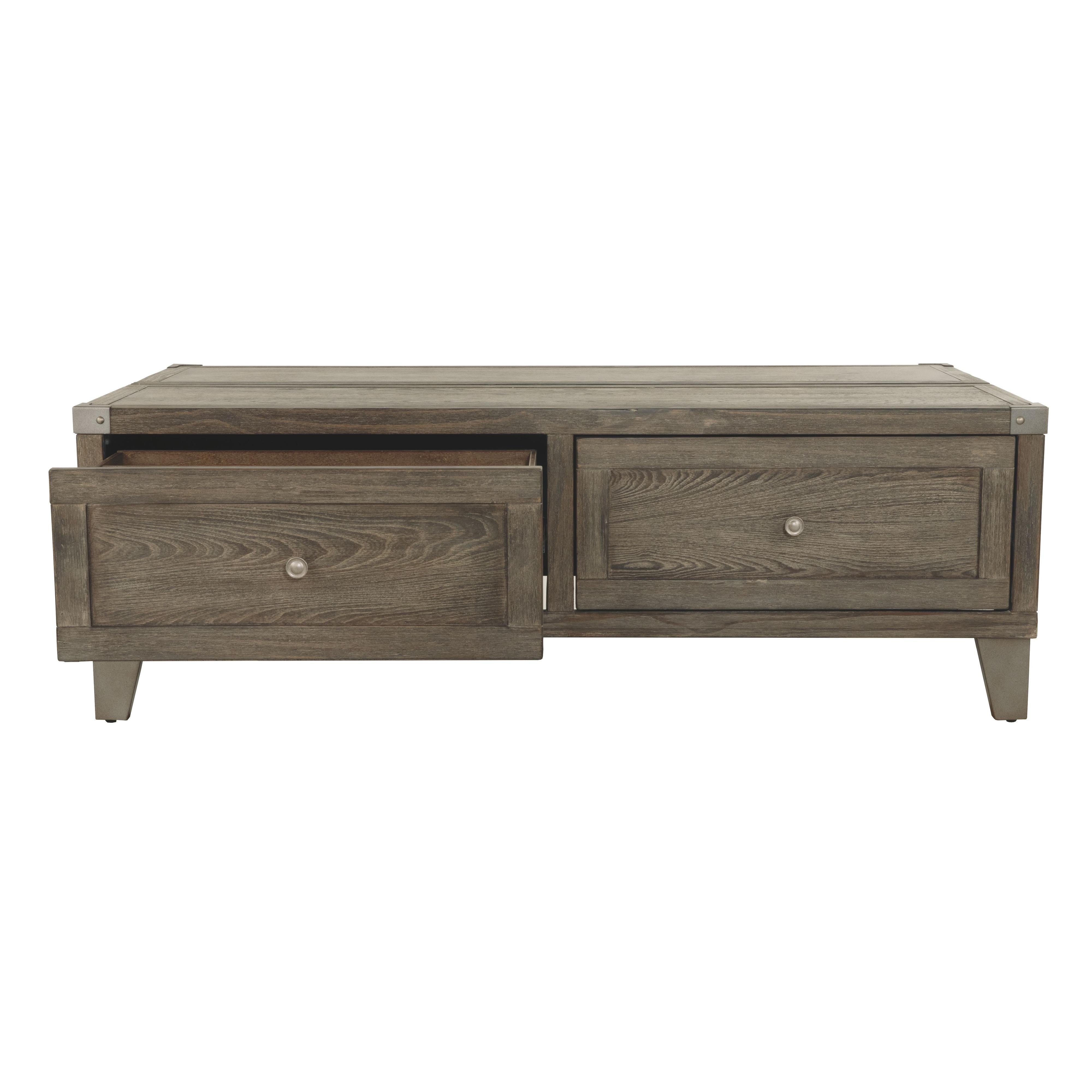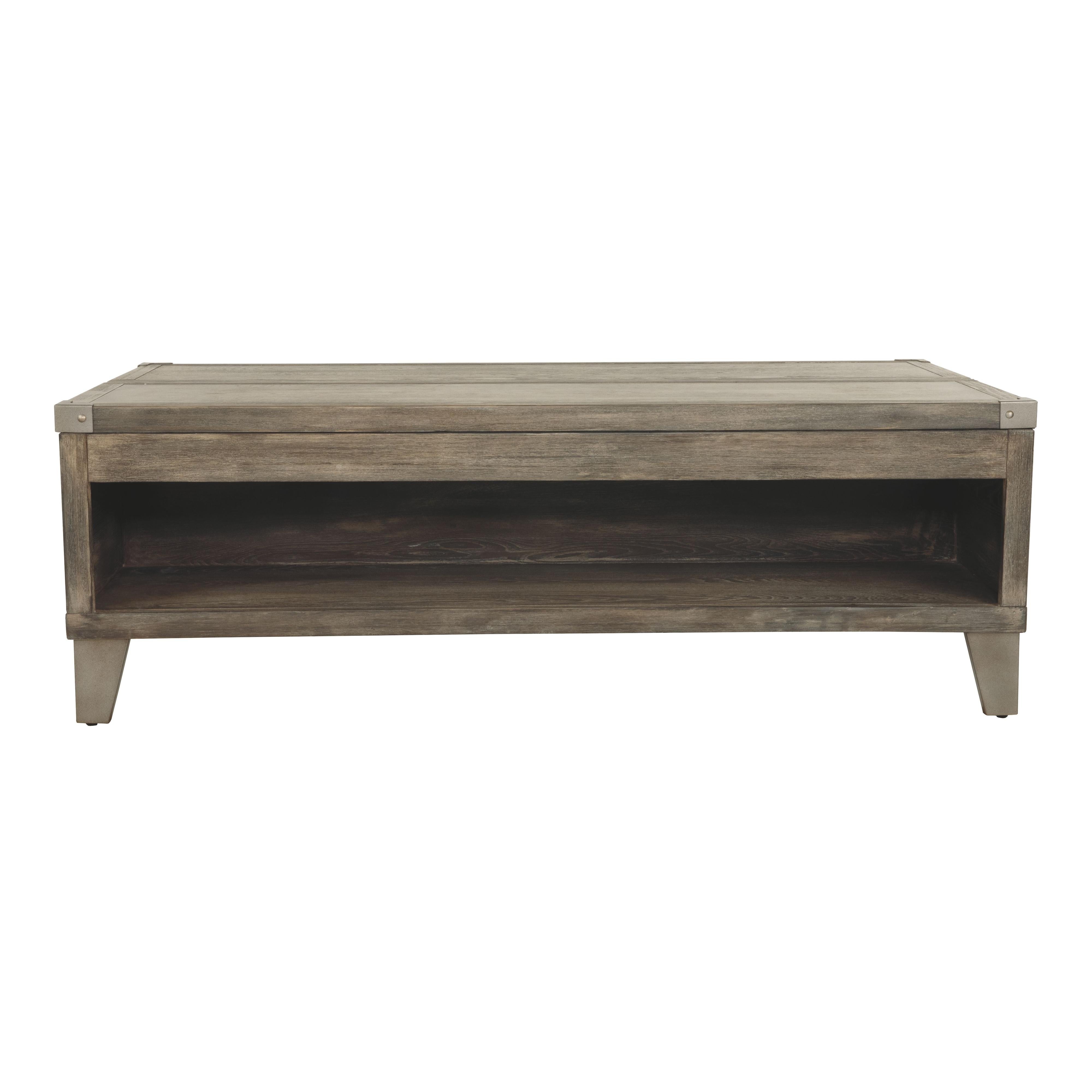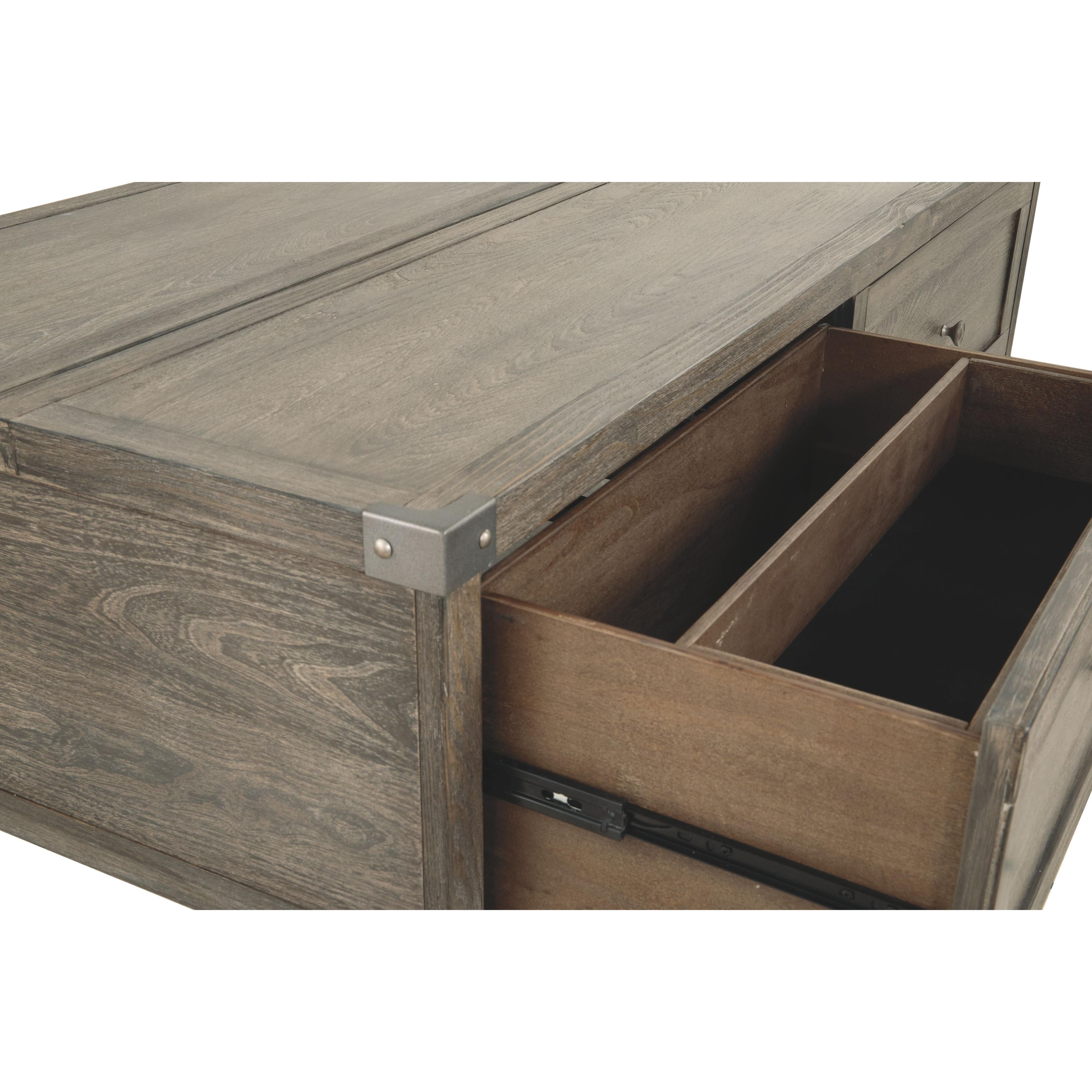 Celebrating the lighter side of modern industrial style, this lift top coffee table is the best in form meets function. The table's less-is-more weathered finish allows the natural wood grain to take center stage. Metal bracket accents and tapered metal feet in a silvertone finish are a cool yet refined touch. Split top design includes a lift top on one side and fixed surface on the other. Two smooth-gliding drawers offer plenty of handy storage.