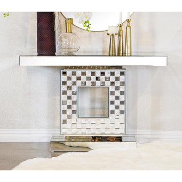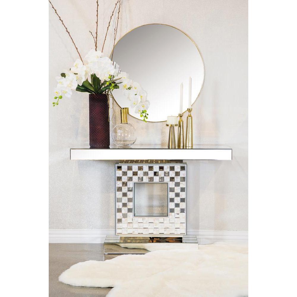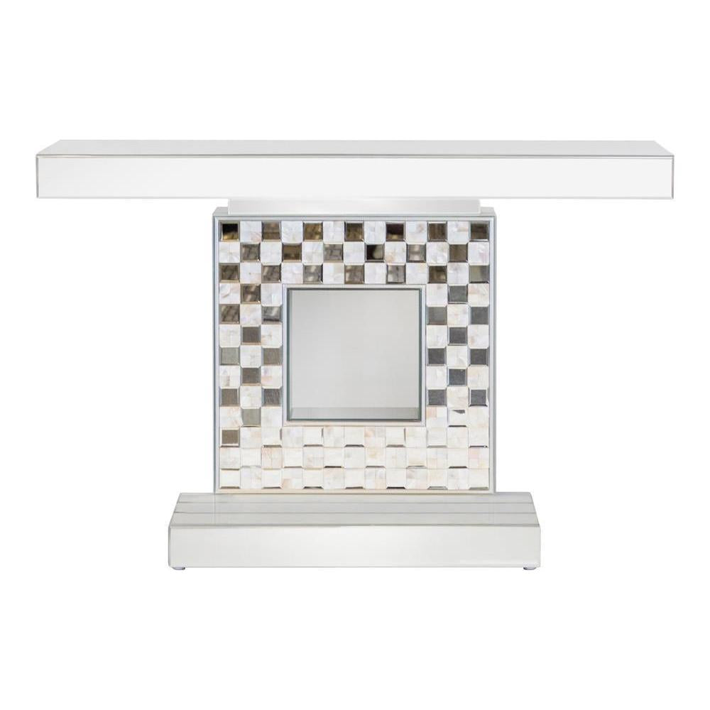 With a stunning, sculptural-like aesthetic, this contemporary console table is sure to catch the eye. with a long tabletop surface covered in a seamless mirror panels, along with a flush matching base for extra stability, this console invites you to display artwork and glamorous decor pieces. the open square shaped base features a geometric checkerboard pattern with lustrous mother of pearl accents. place this elegantly striking console table within a modern entryway foyer for a chic look. or place it within a dining room for a place to showcase decor.