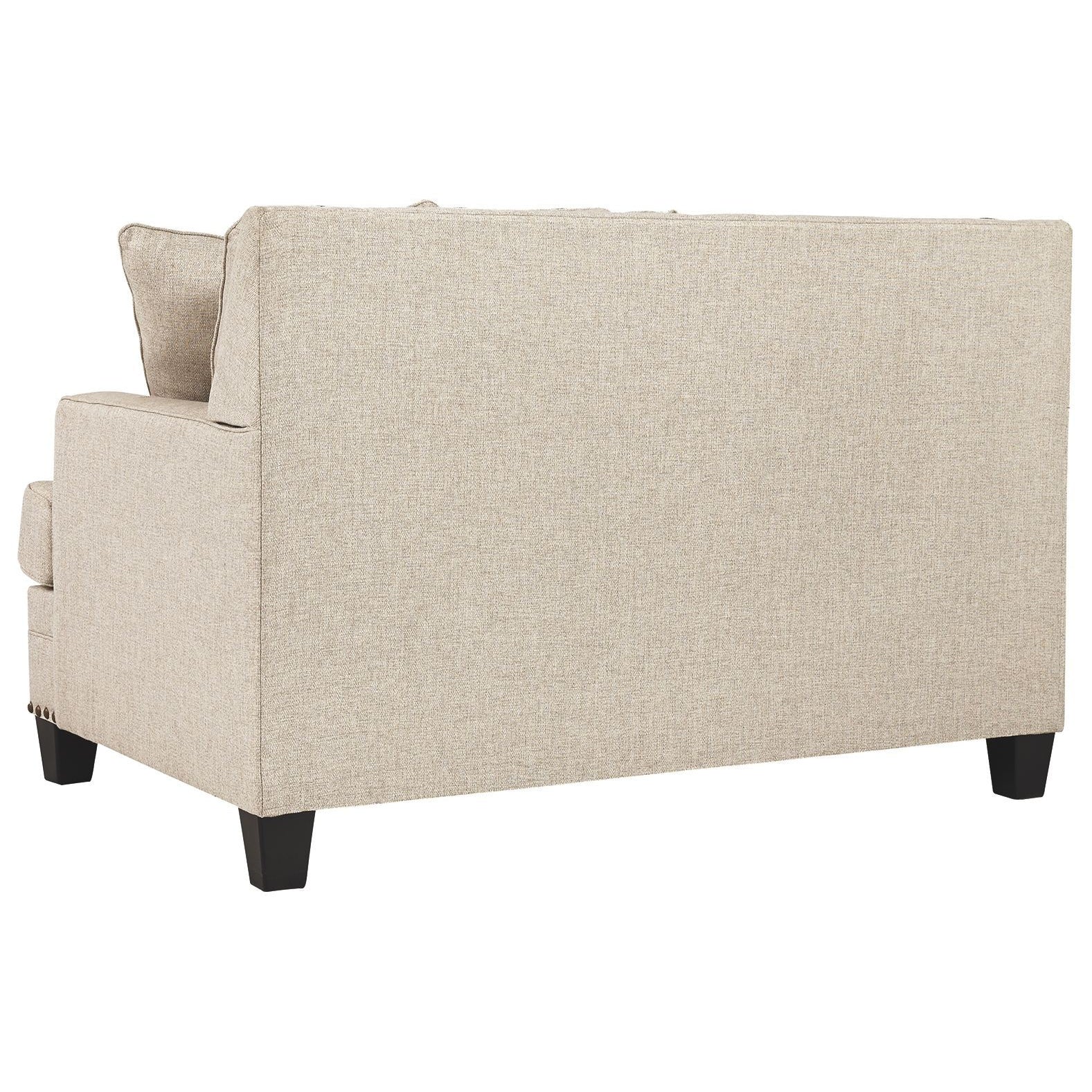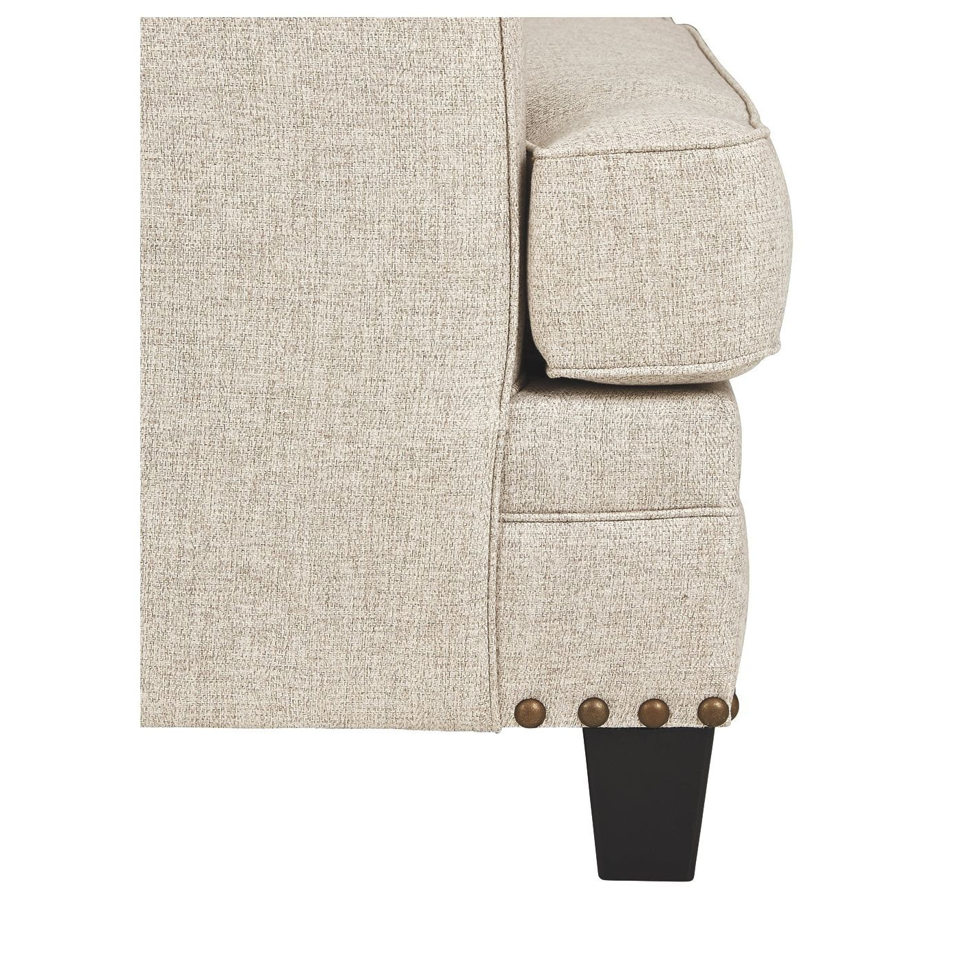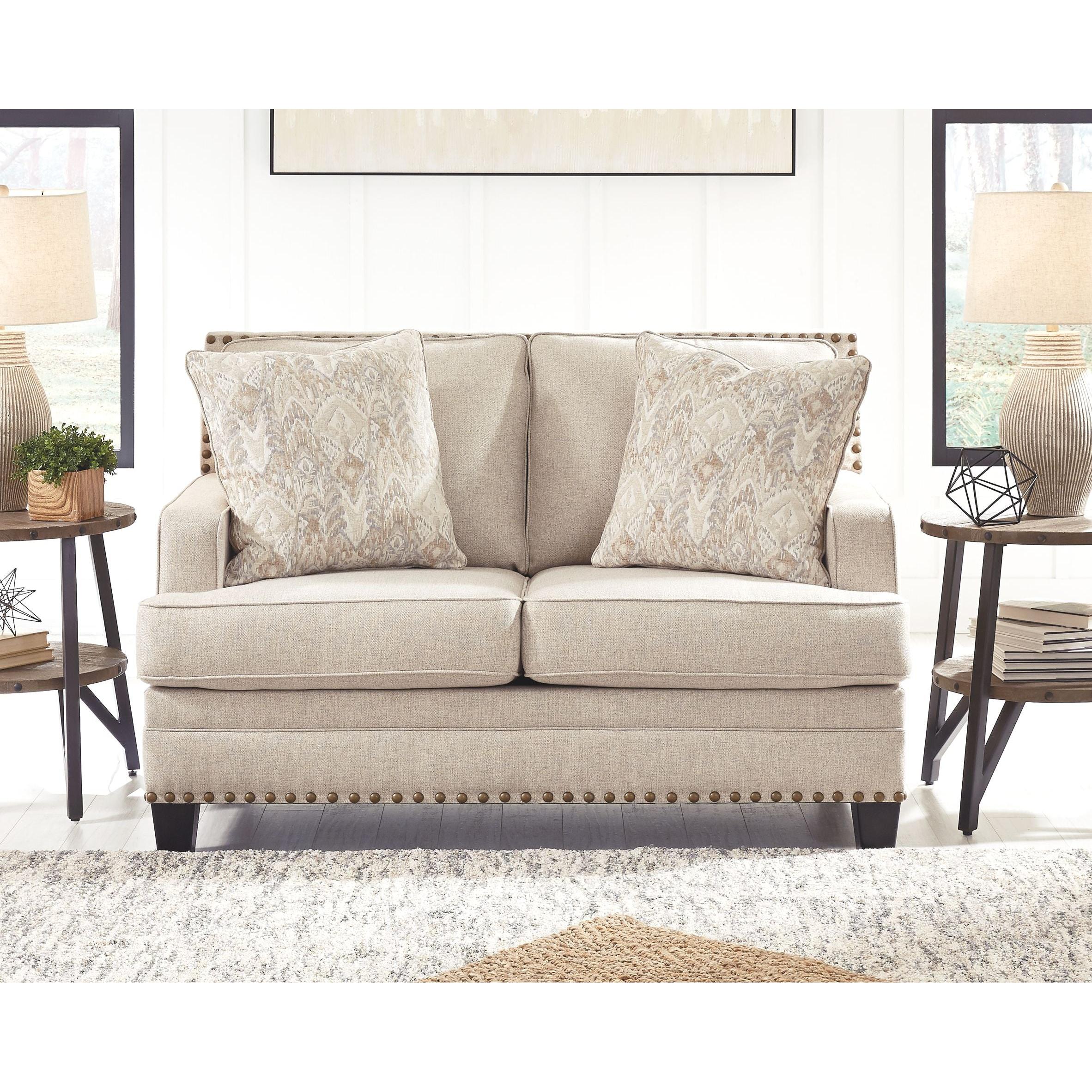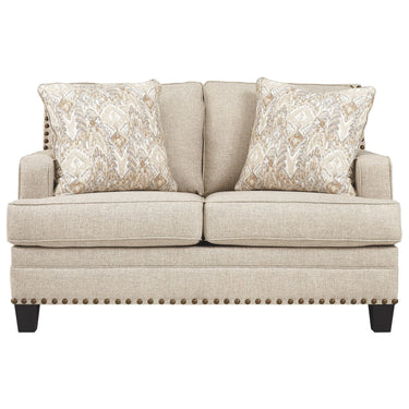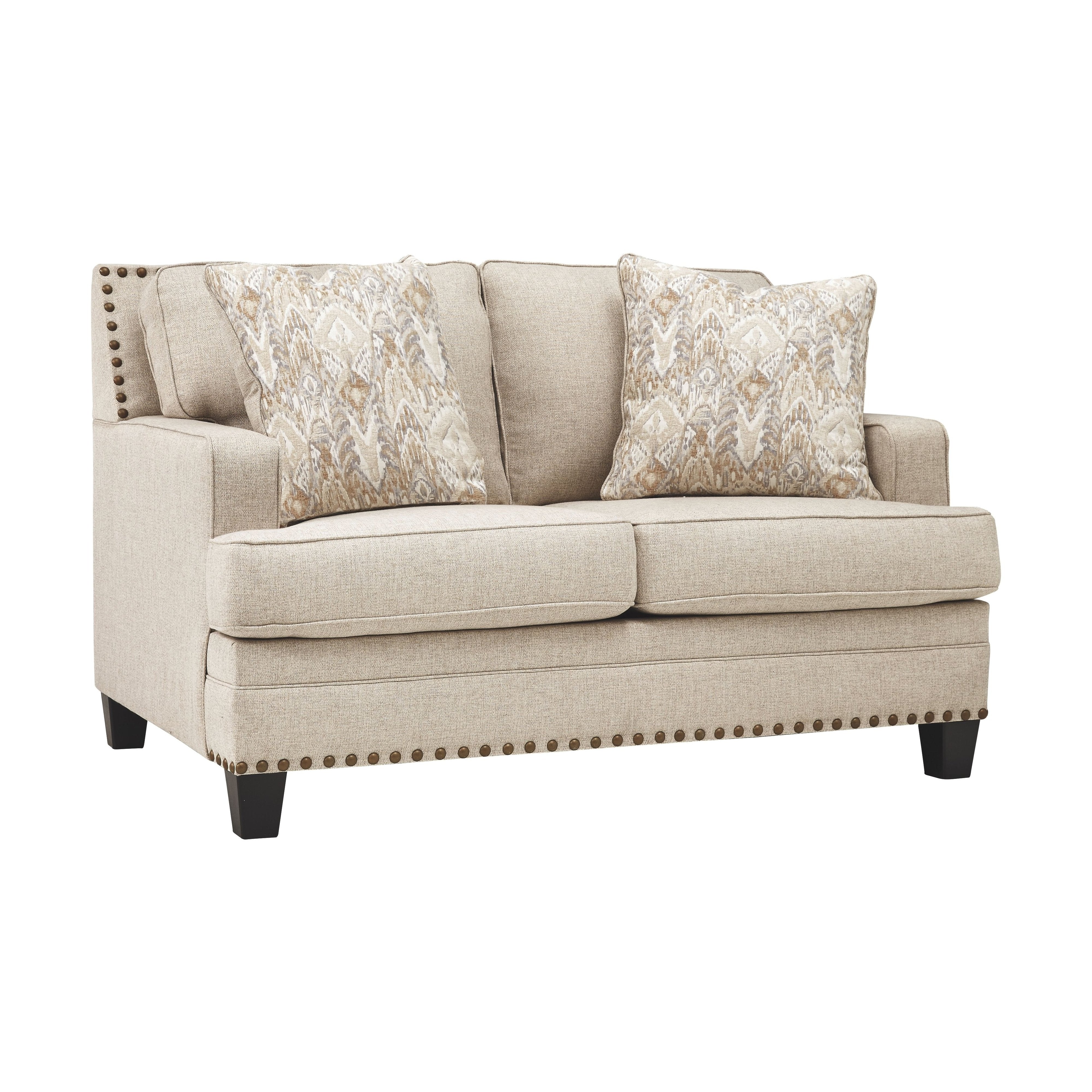 A case of contemporary and classic style influences coming together in a beautiful way, this loveseat in beige brings a fresh perspective to modern farmhouse living. Distinctive elements include t-cushions that wrap around setback track arms, nailhead trim and a lovely linen-weave upholstery for an up-to-date feel. Muted hue designer throw pillows master the art of subtlety.