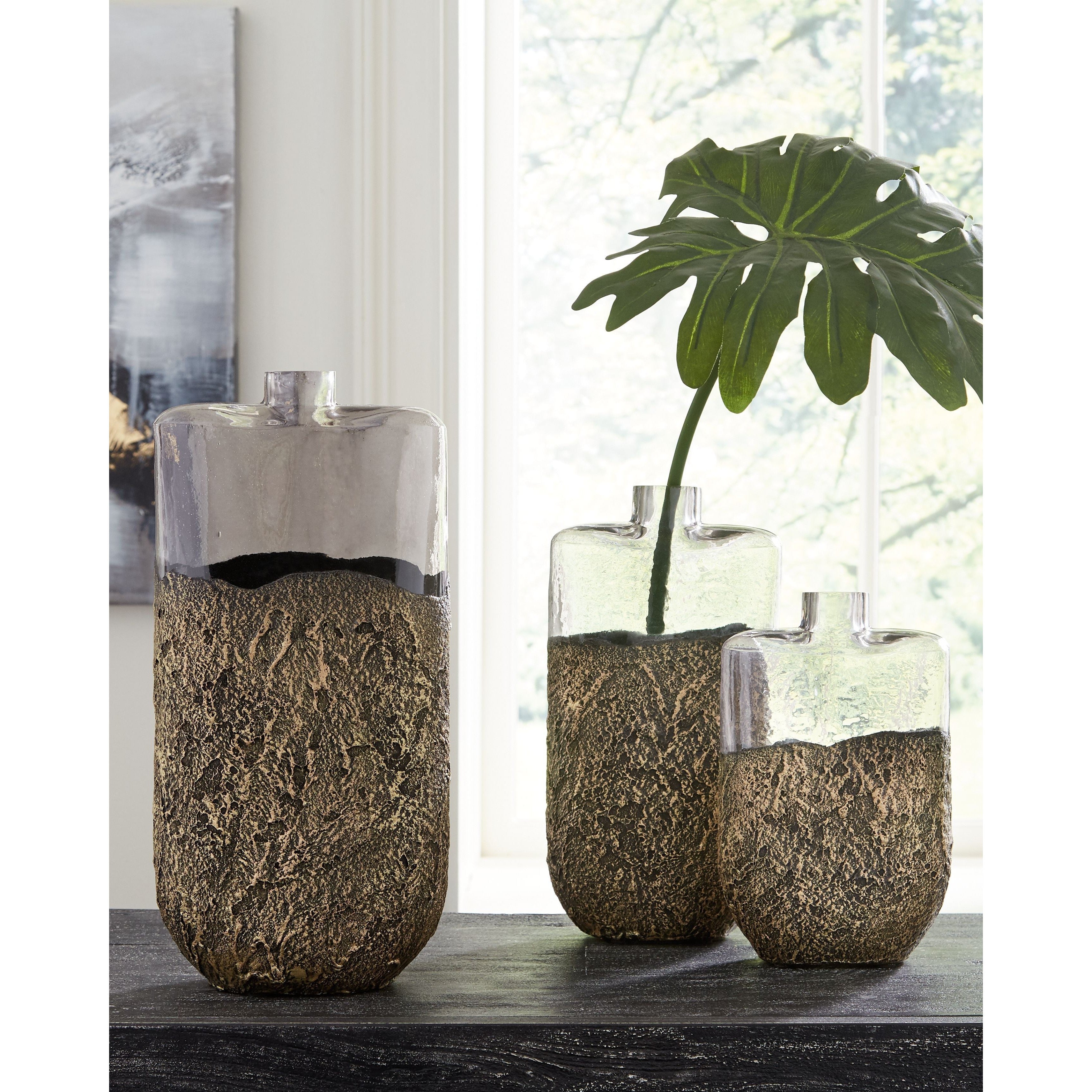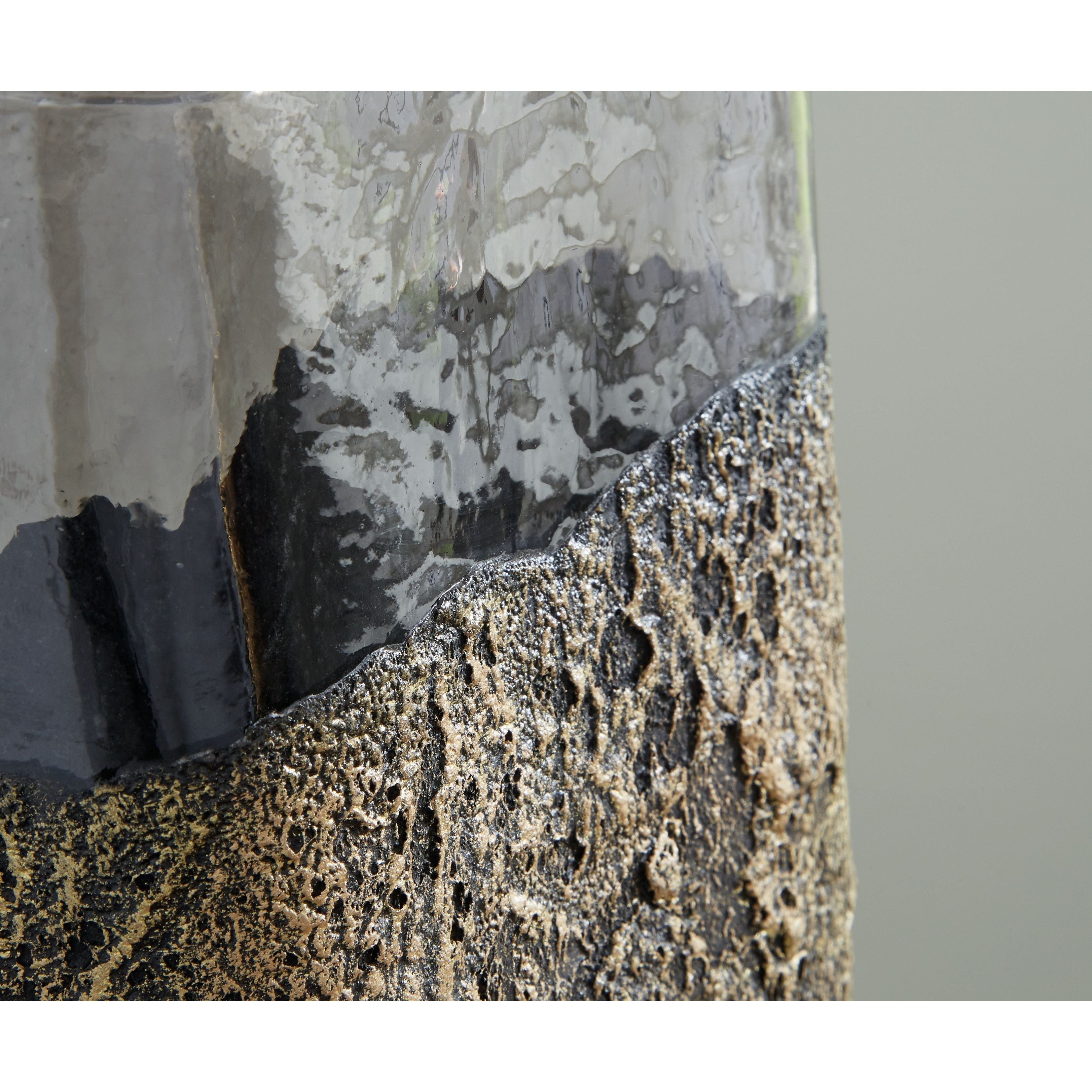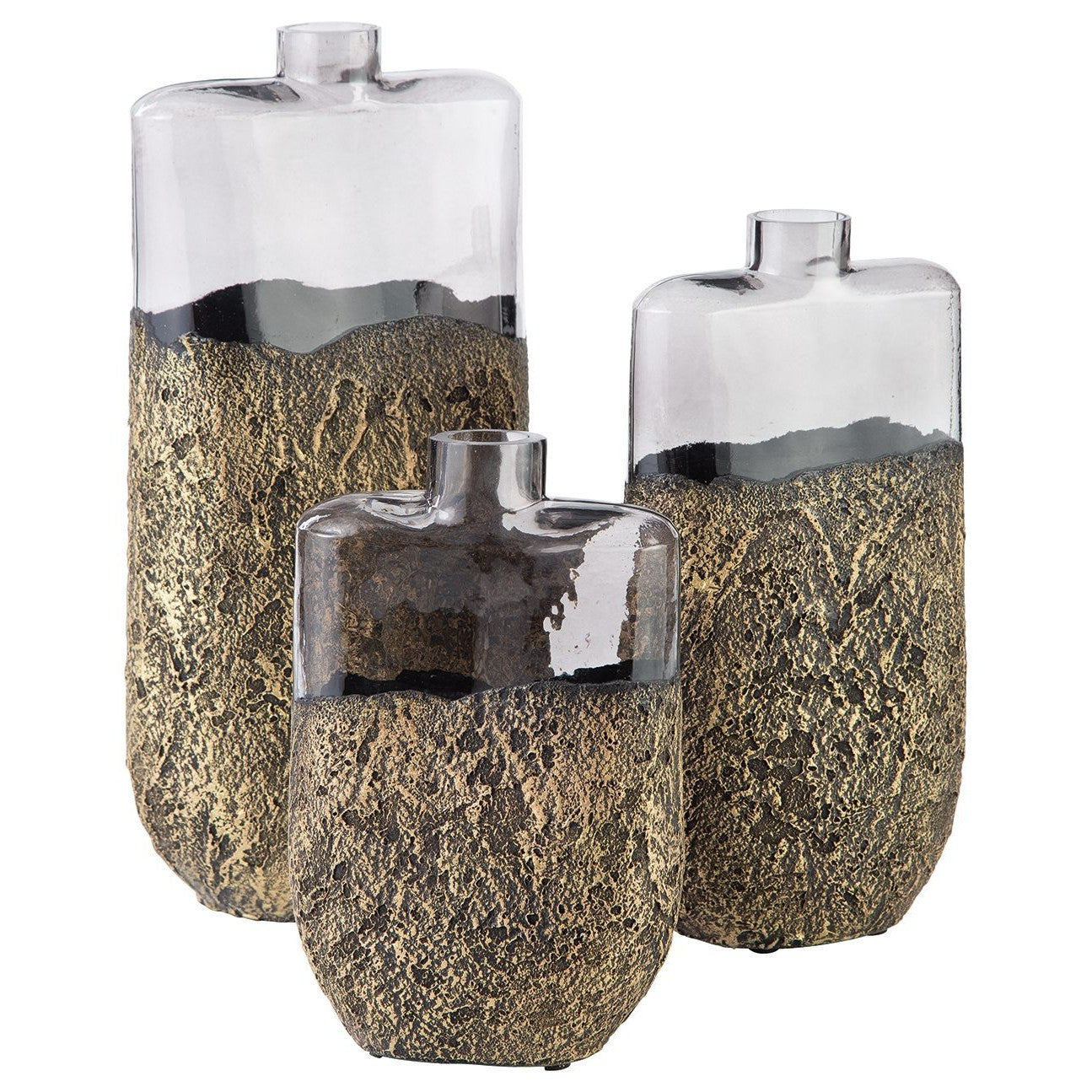 Give your space a contemporary vibe with this vase set. This set of 3 vases is crafted of mouth-blown antiqued goldtone finished glass with heavy sand texture making this unique design a stand out in your home.