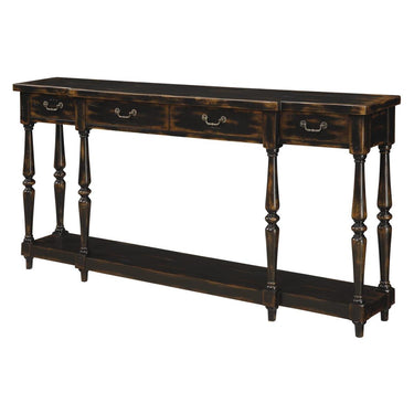 With a breakfront design, this console has a beautifully done Apperson Black finish with a rub through look for added interest. There is lots of storage in the four drawers and plenty of display space on the open shelf below. The elegantly turned legs add attractive detail to the simple lines