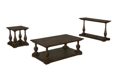 Traditional elements and a rich finish come together in this transitional coffee table. built of a tropical wood, this coffee table presents a spacious rectangular designed with an open bottom shelf for displaying decor, books and more in the living room. column-like turned pedestal legs lend a classic element as a plank design tabletop and other surfaces offer a rustic feel. in addition, the rich coffee brown wood finish offers a refined, traditional aesthetic. place this sophisticated coffee table in front of a chesterfield sofa or an oversized sectional.