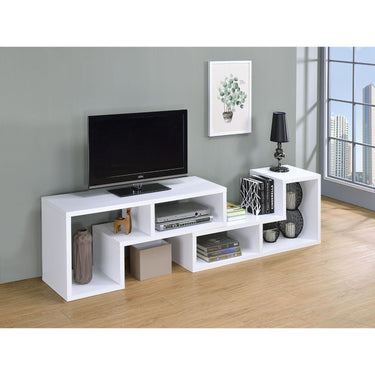 Perfect for a variety of uses, this two-piece bookcase and tv console is fabulously versatile. it allows you to switch between various bookcase and tv stand configurations for your convenience. bold, l-shaped shelves are arranged in striking geometric designs for a modern look. a while finish enhances its contemporary appeal. crafted from top quality materials, this bookcase is sturdy, stylish, and smart.