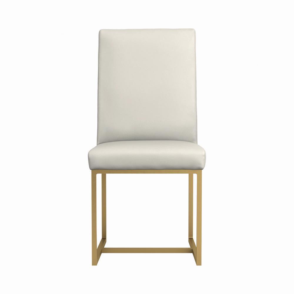 Complete your modern dining space with this set of two sleek dining chairs from the conway collection. these chairs showcase a metal base with clean, straight lines in perpendicular angles for geometric appeal. the metal base's aged gold finish adds a touch of glamour to this simple design. the fully cushioned seat and back are upholstered in supple grey leatherette so you can dine in comfort. pair with our desmond dining table for a truly striking dining room group sure to spark conversation.