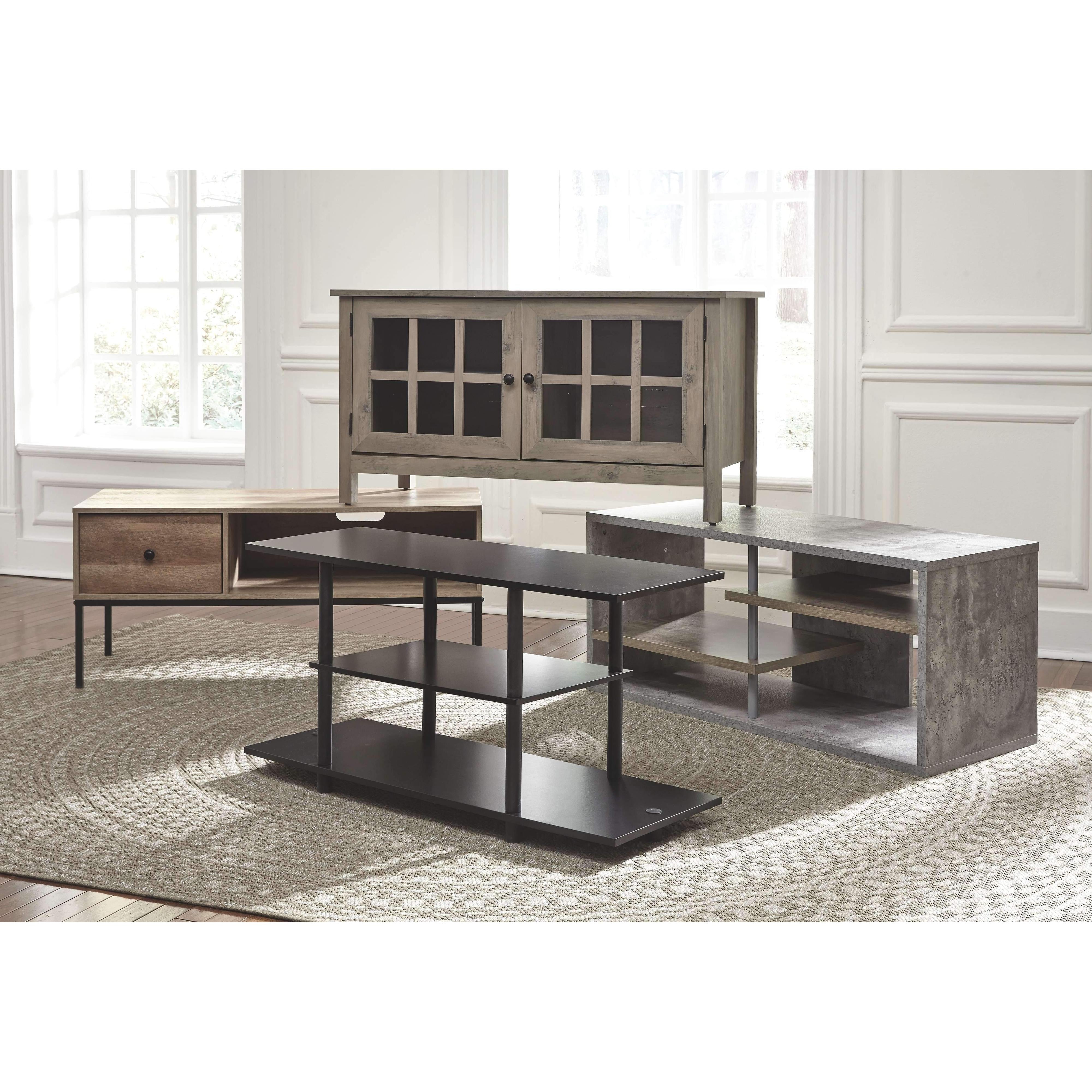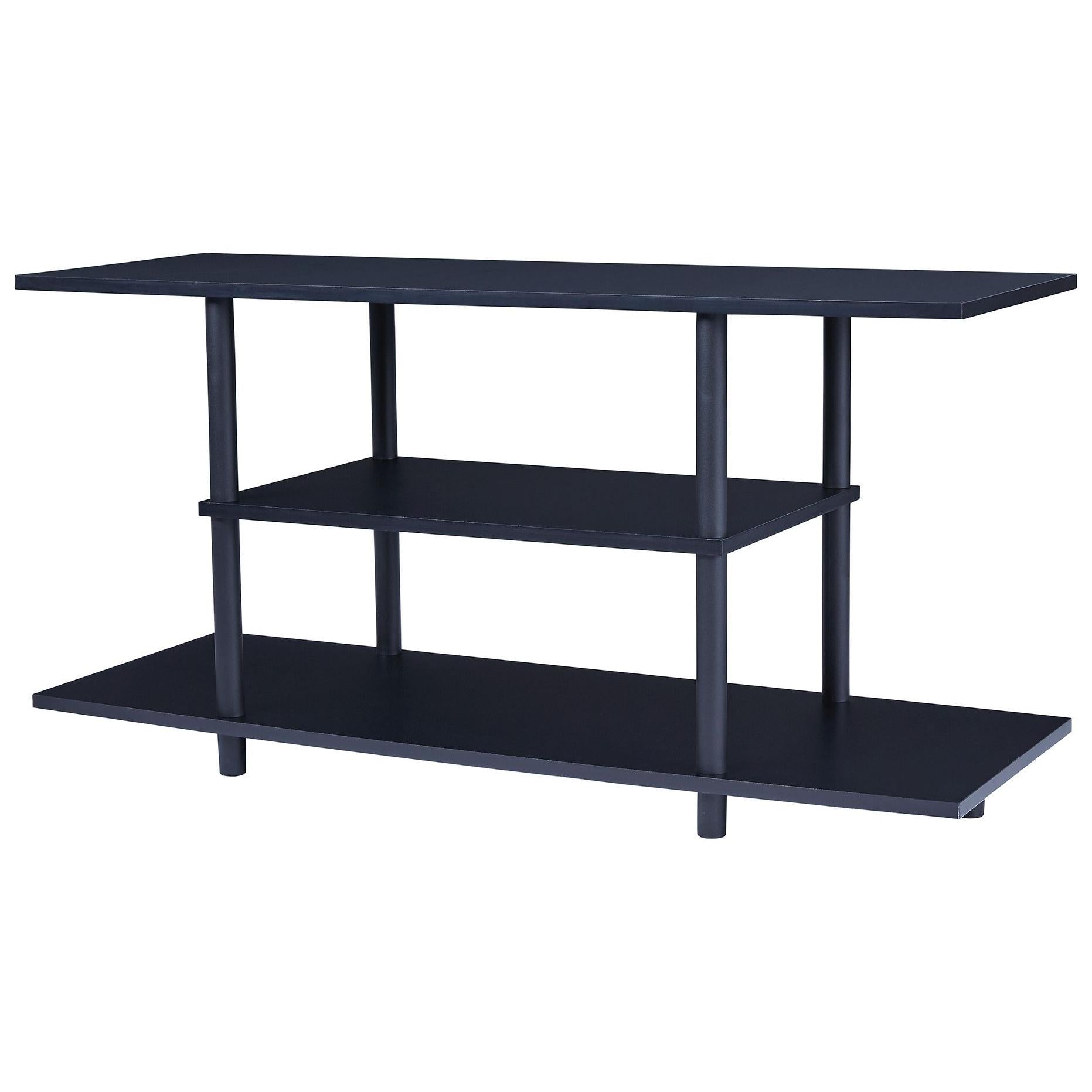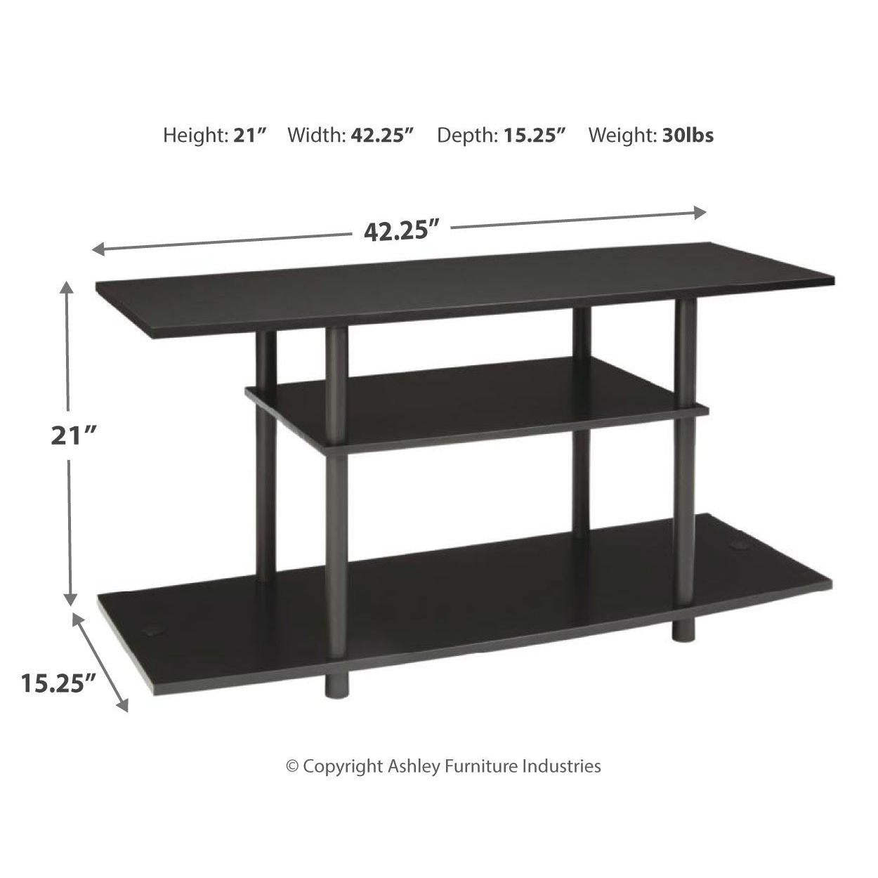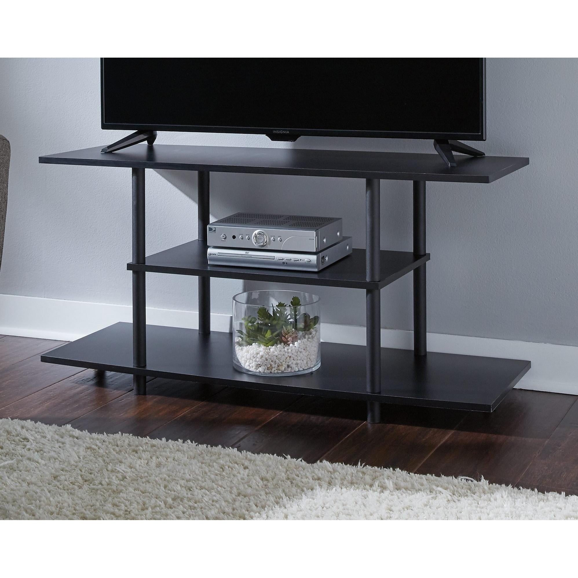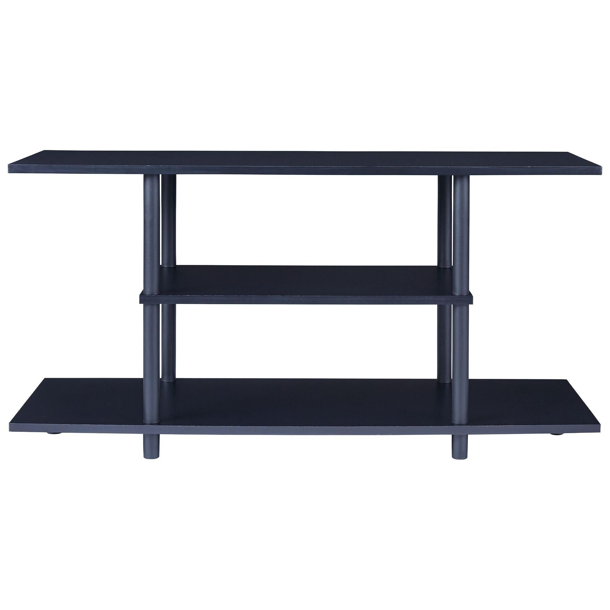 Watch TV in the modern practicality of this 42-inch TV stand. Designed with your enjoyment in mind, this open shelf styled stand offers two shelves, perfect for holding your media equipment. You'll be impressed with its big top, ideal for accommodating TVs up to 42 inches wide. The matching lower shelf and smaller middle shelf will keep everything easily accessible. The large lower shelf with open ends can accommodate a pair of speakers or you can use the space to display large accessories.