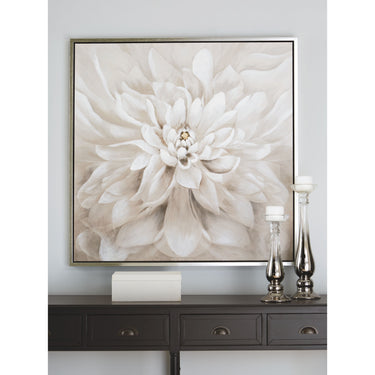 Bring serenity to your modern paradise with this wall art. Unfurled tight pedals full of enchanting beauty depicted in this flower portrait provide a soothing backdrop in any decor, especially a modern decor. The flower is in shades of taupe and white and has gold leaf embellishment—quite pretty for adding a touch of nature to any room.