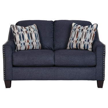 Upholstered in a striking midnight blue fabric with a soft brushed feel, this loveseat is undeniably handsome. Sloping arms are beautifully outlined with brushed nickel nailhead. Plush seating sets the scene for toss pillows immersed in a glasswork-inspired pattern design.